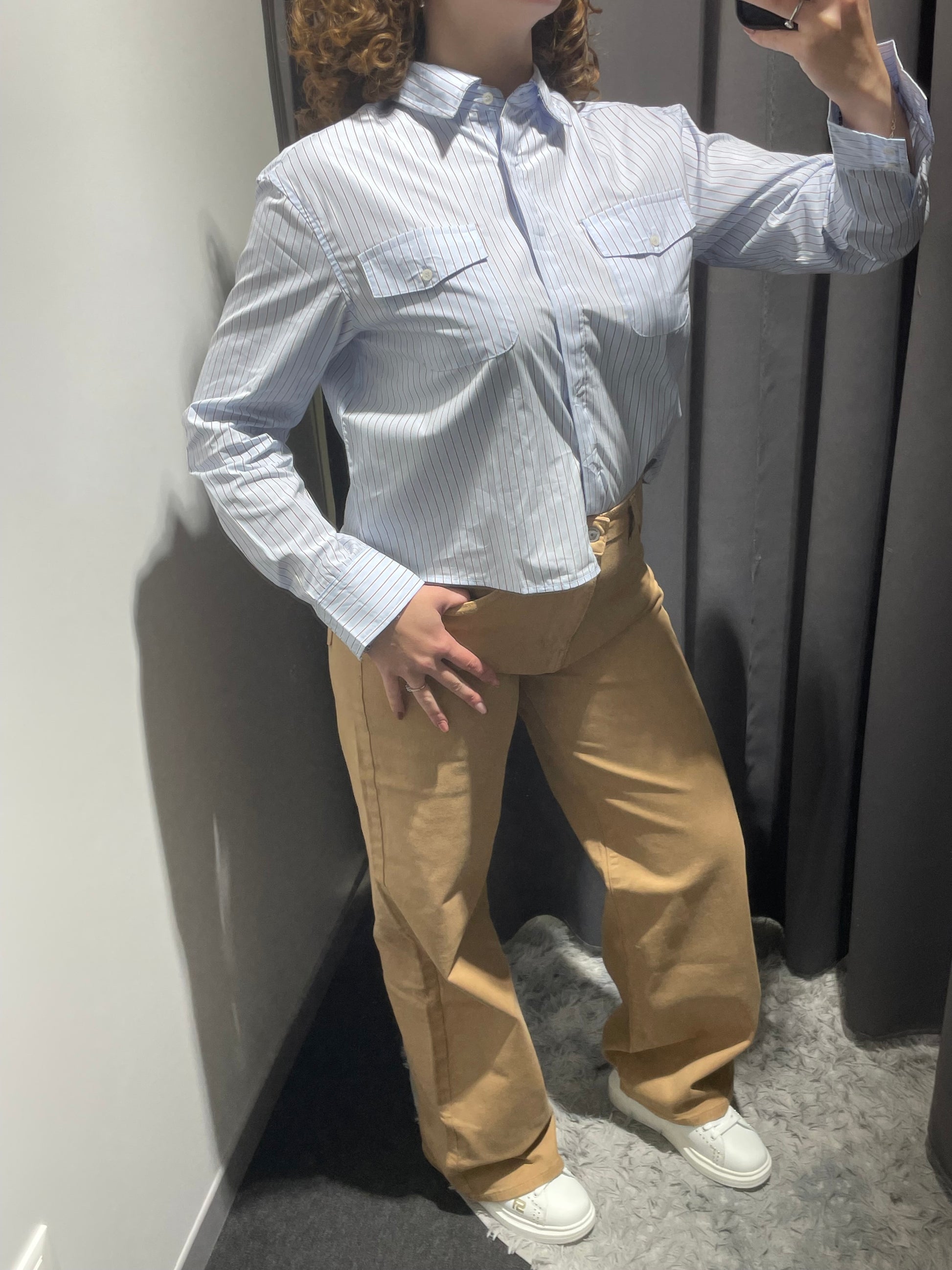 Camicia dal taglio trapezio che regala movimento e comfort. Il motivo a bastoncini celeste crea un effetto dinamico e moderno, perfetto per chi ama uno stile contemporaneo. La silhouette ampia garantisce libertà di movimento, mentre il colore celeste si abbina facilmente con i vostri capi preferiti. Un capo versatile per il guardaroba di tutti i giorni.