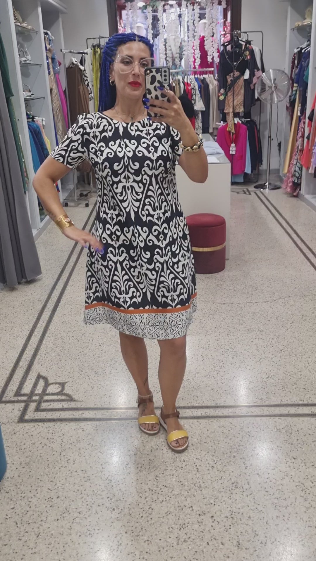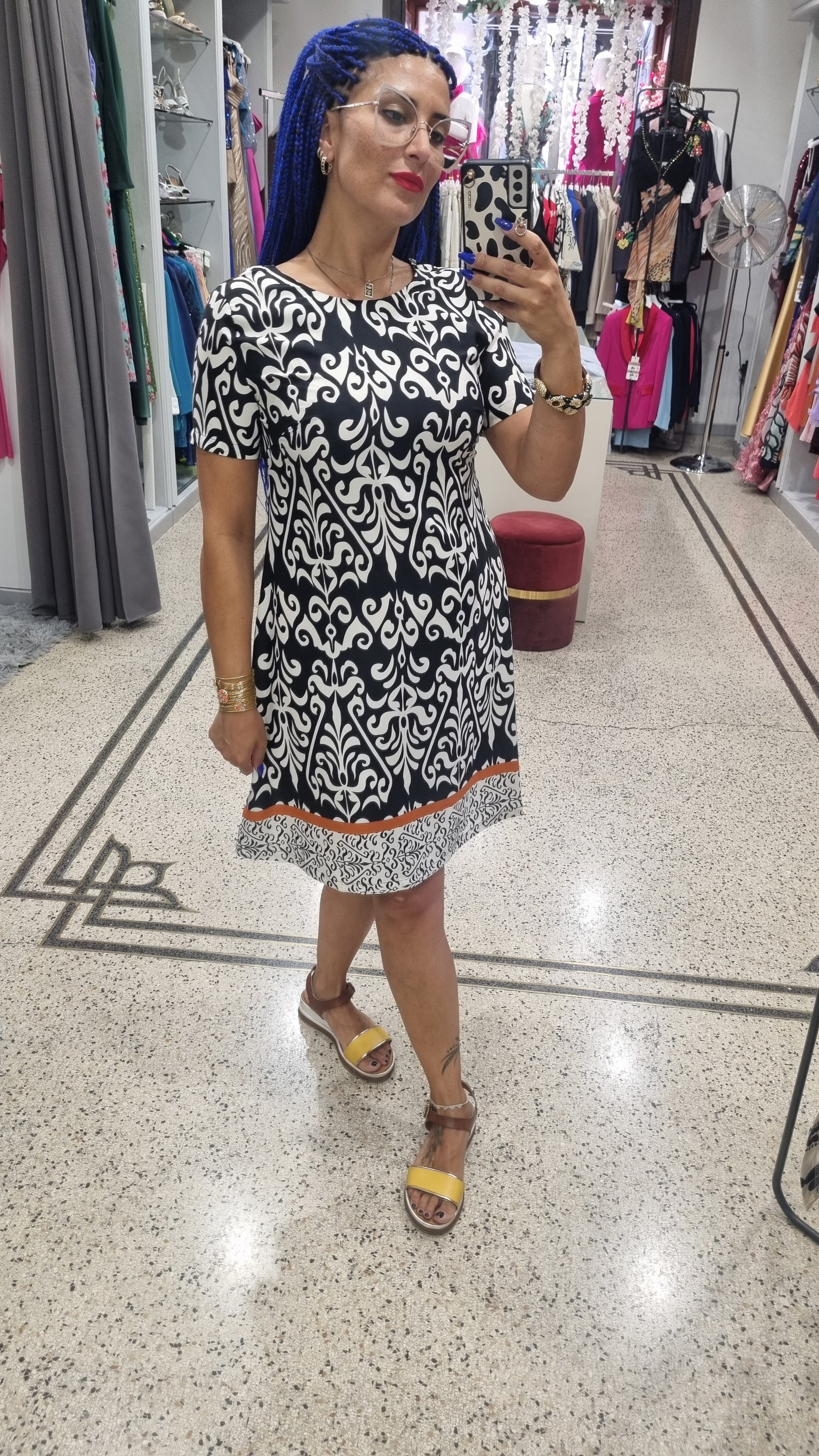 Abito taglio dritto con stampa in bianco e nero, manica corta, chiusura sul retro con zip.