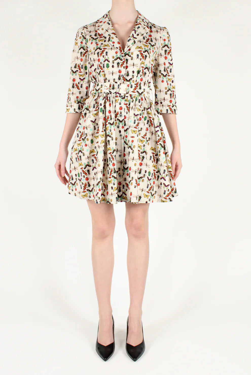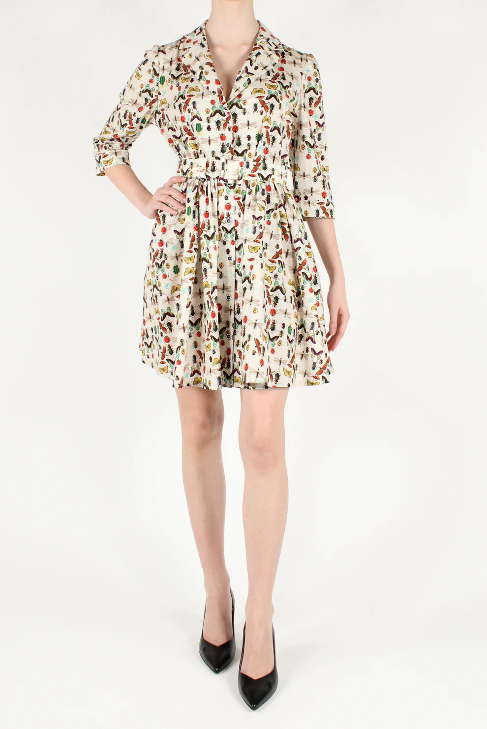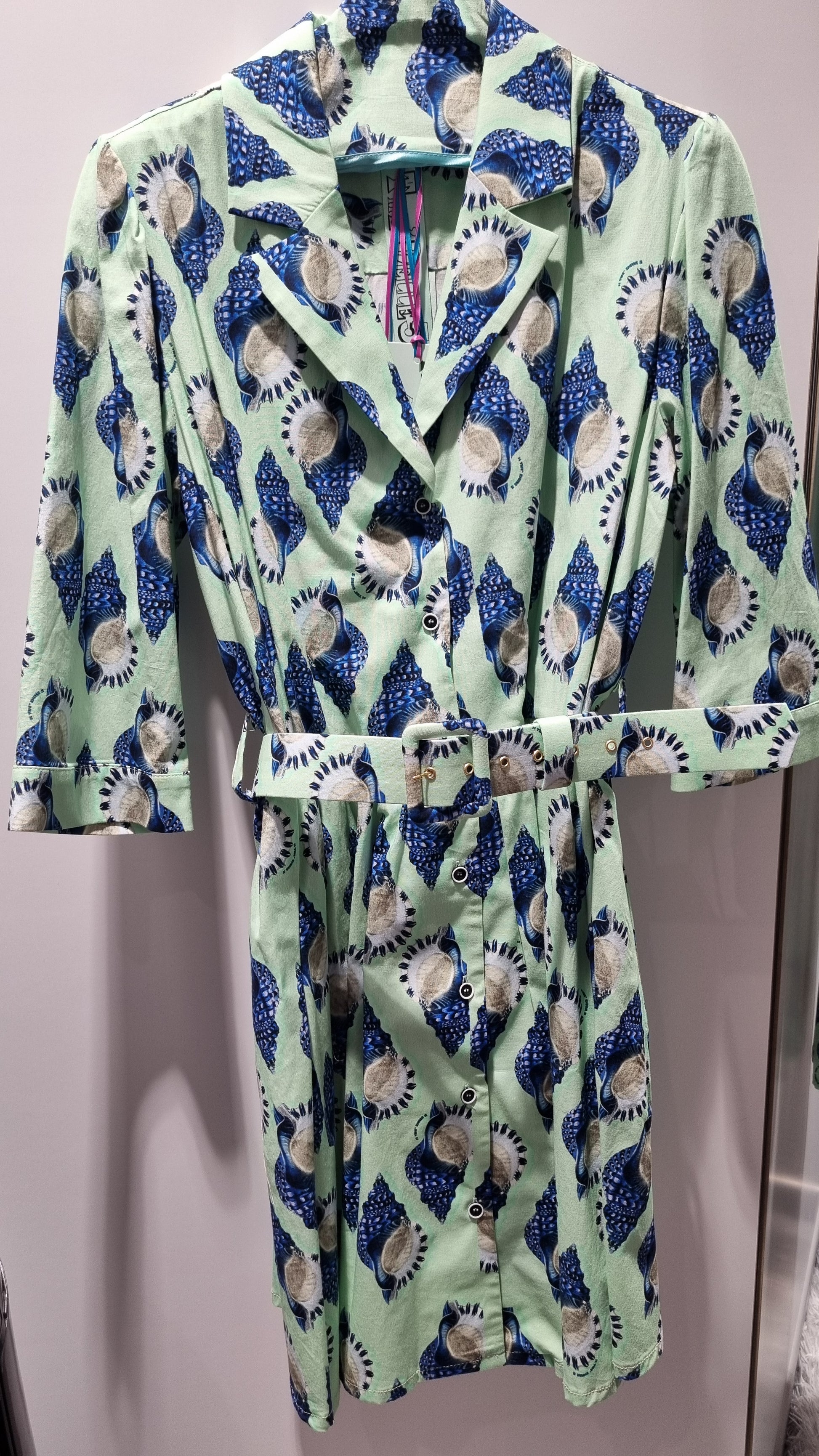 Abito chemisier corto con stampa in cotone leggermente elasticizzato. Colletto a revers, con maniche a 3/4, con tasche laterali ed allacciatura a bottoni. Cintura inclusa removibile.