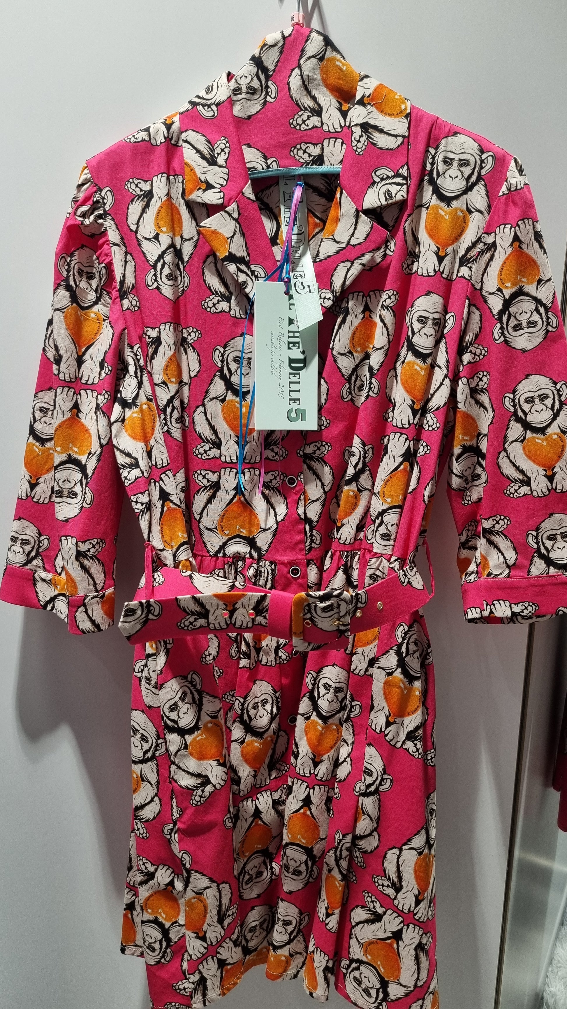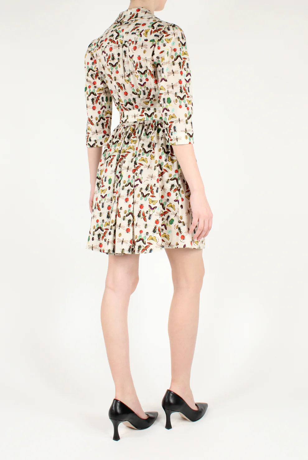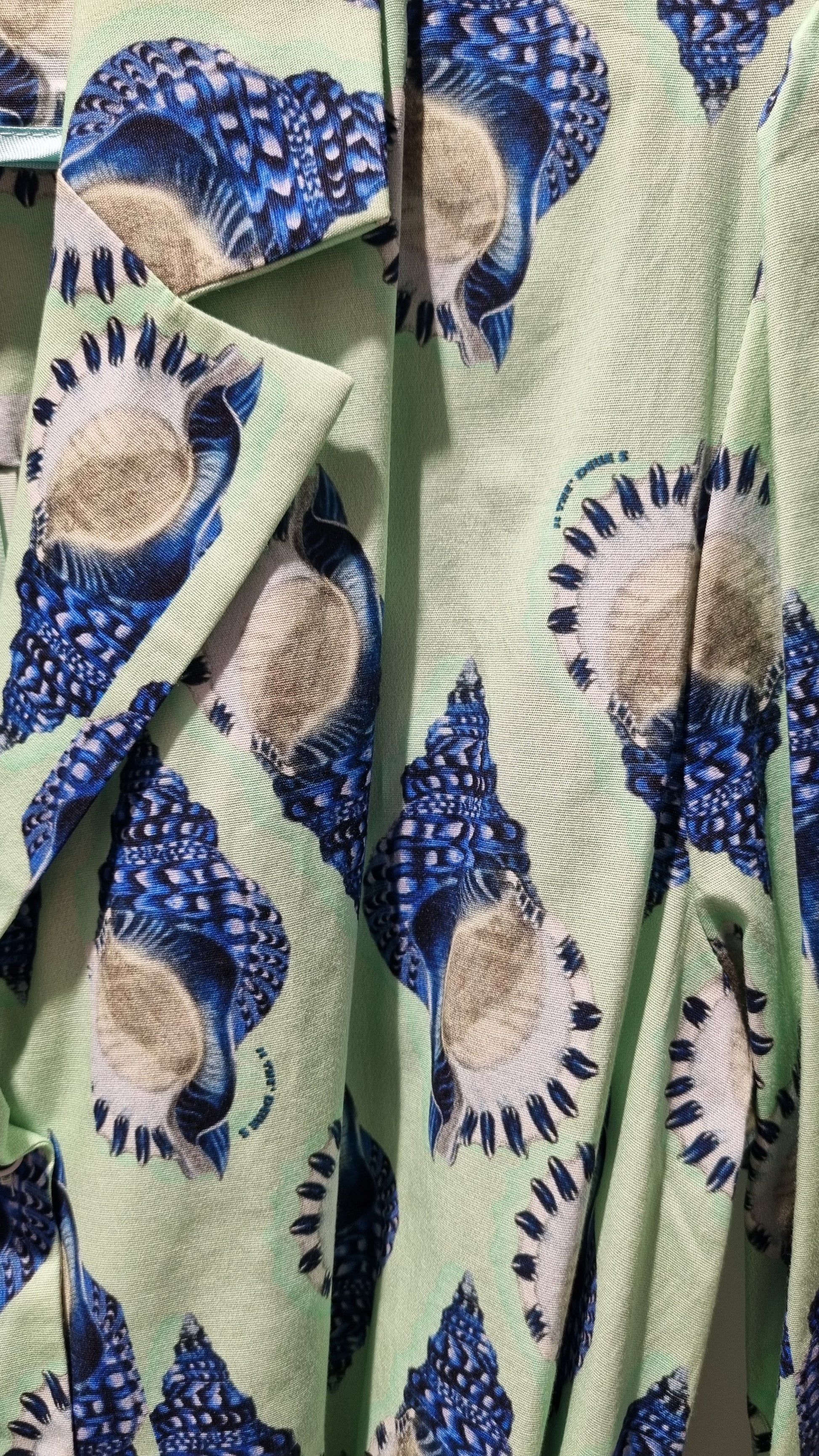 Abito chemisier corto con stampa in cotone leggermente elasticizzato. Colletto a revers, con maniche a 3/4, con tasche laterali ed allacciatura a bottoni. Cintura inclusa removibile.
