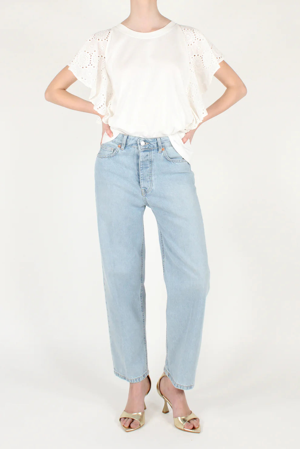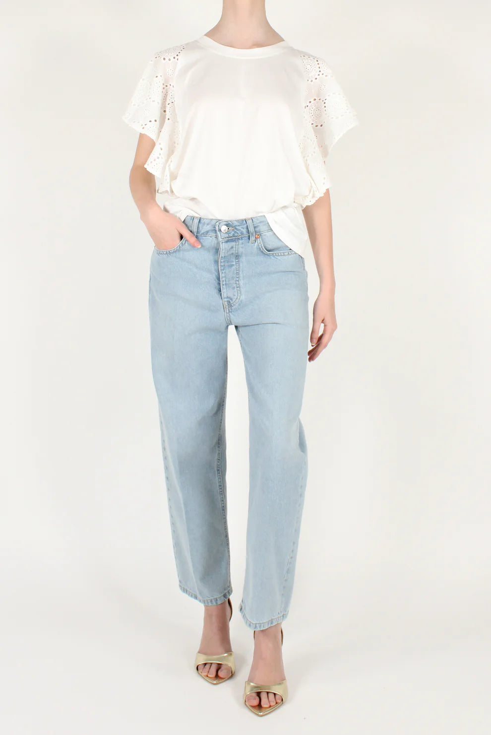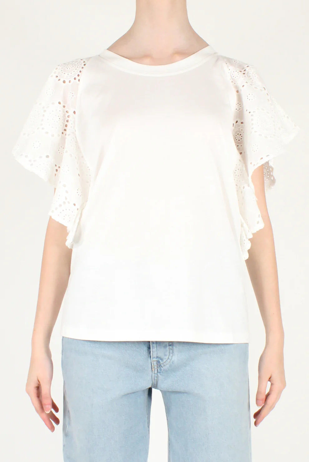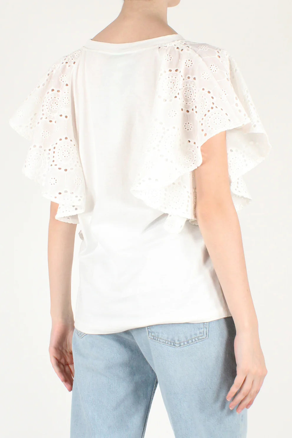T-shirt con volants in sangallo alle maniche. Scollo tondo, maniche corte, 100% cotone. IL THE' DELLE 5