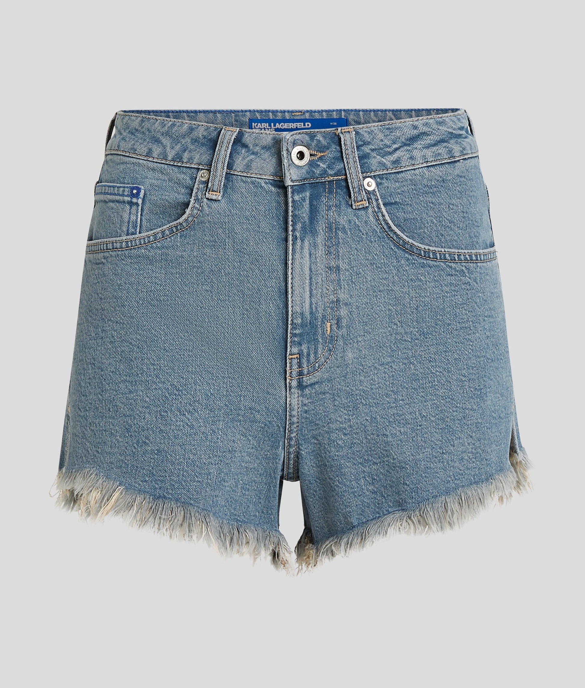 KARL LAGERFELD Shorts in denim sfrangiati vita alta con patta in ecopelle nera