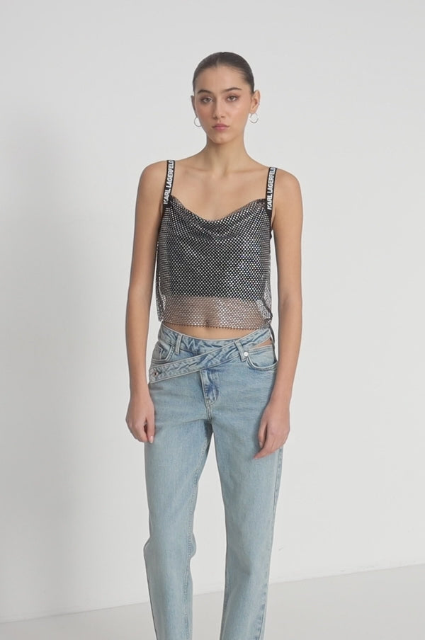 KARL LAGERFELD Top cropped di rete di strass foderato con spalline logate