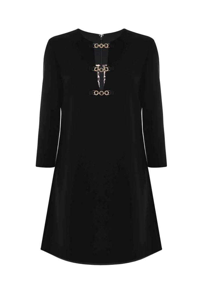 Elegante e versatile, questo abito corto è caratterizzato dallo scollo a V impreziosito da catene dorate. Il capo presenta una linea scivolata e fondo svasato.