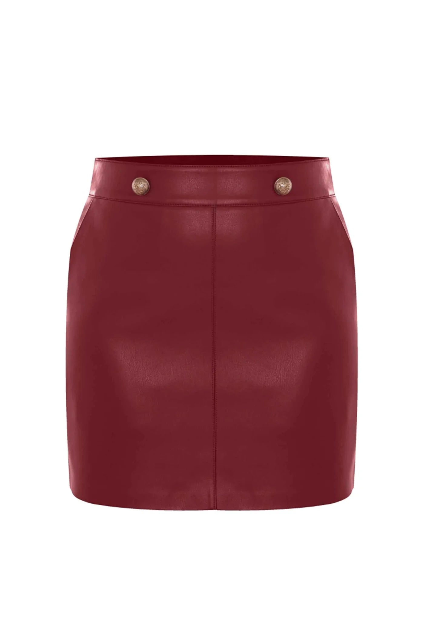 Lo stile minimal di questa gonna corta è impreziosito dal tessuto in ecopelle e da due bottoni dorati in vita che regalano stile e carattere al capo.