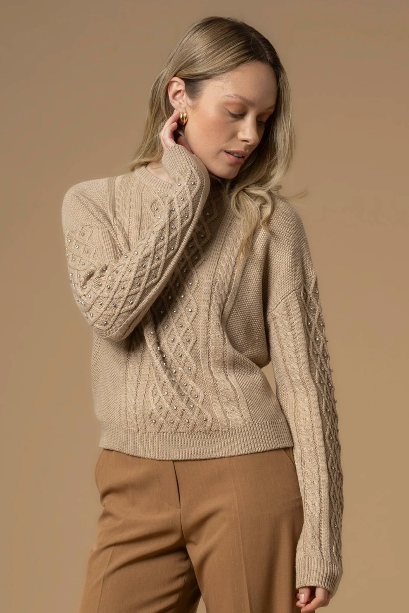 Una pioggia di punti luce scintillanti impreziosiscono questa maglia della capsule Pure Verve caratterizzata da una lavorazione a trecce e rombi. Questo capo presenta scollo rotondo, bordi a costine e giromanica sceso.