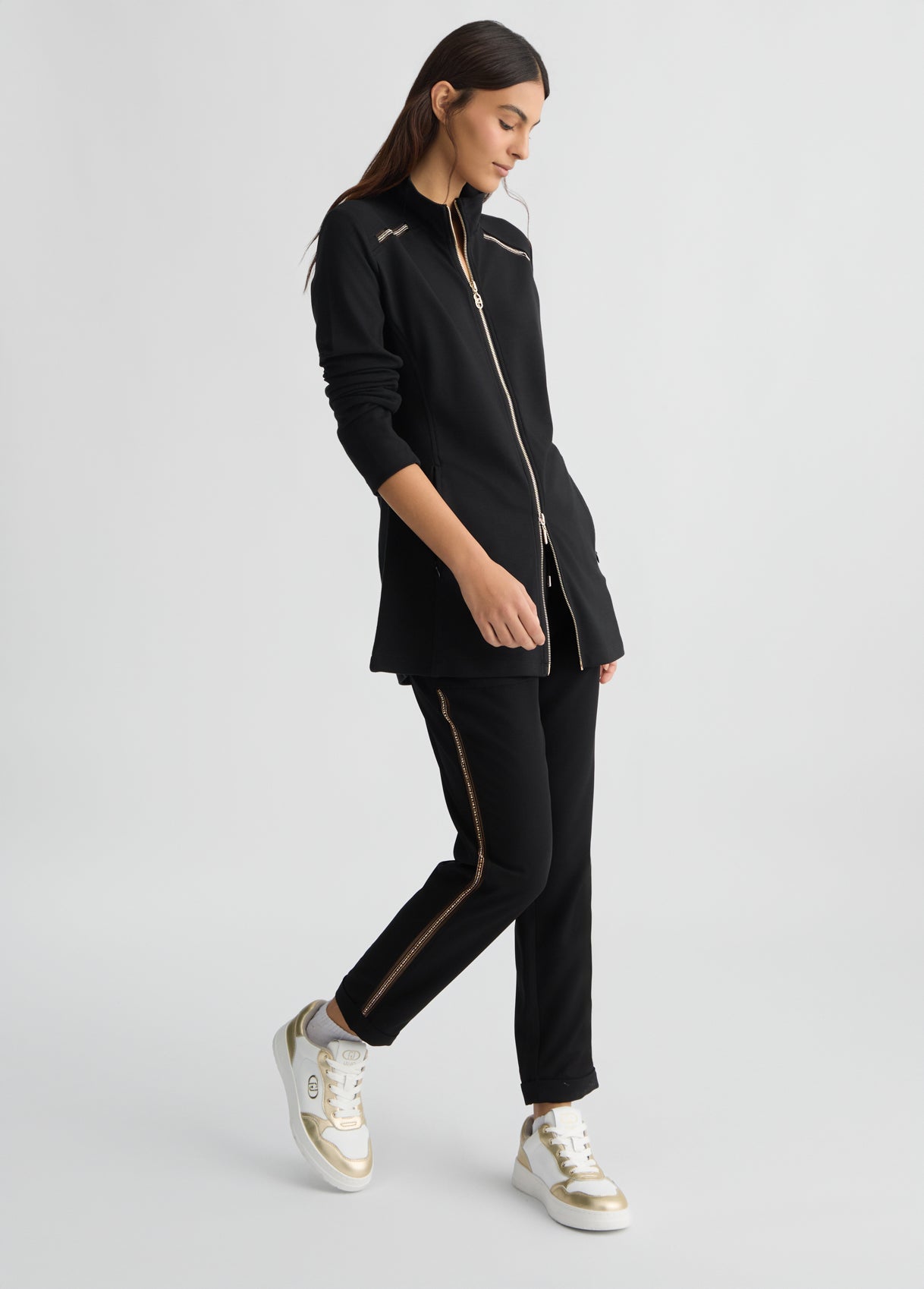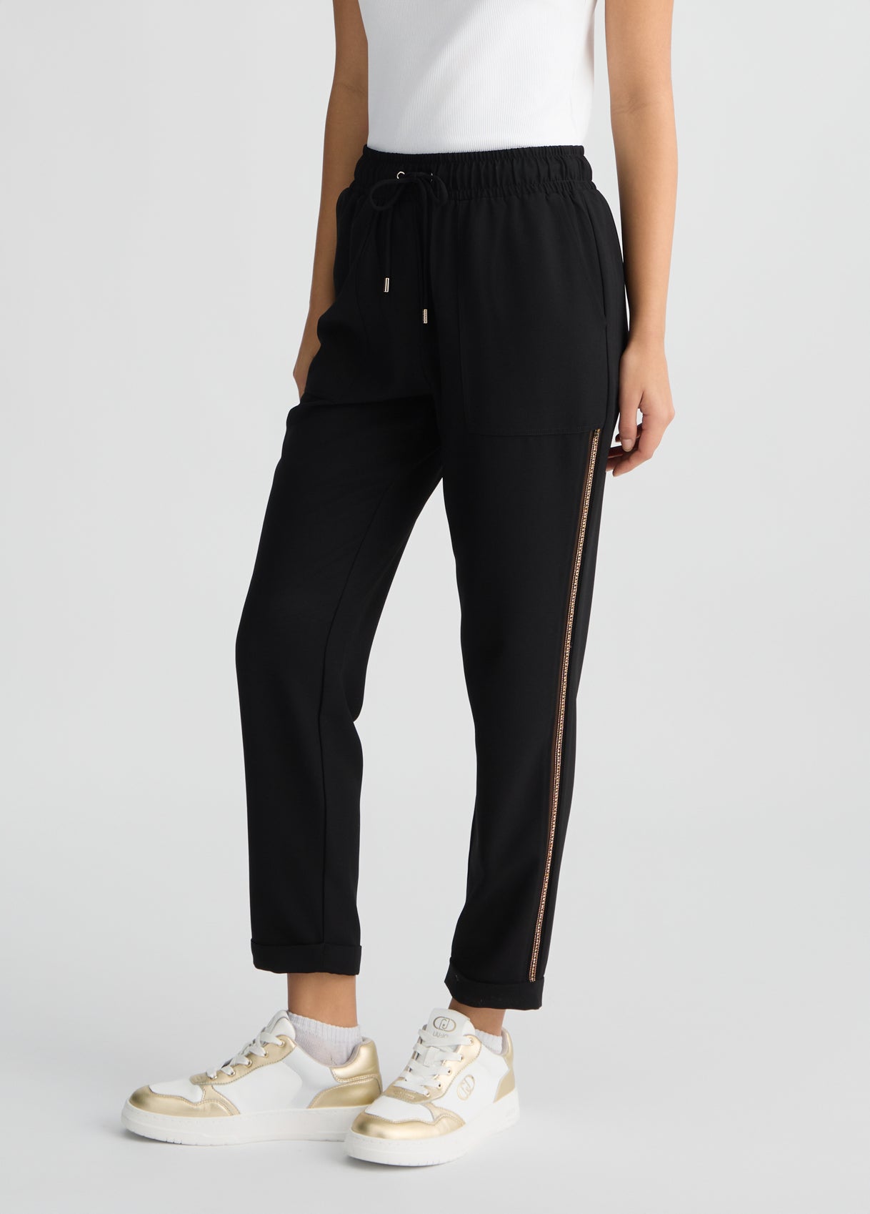 LIU JO Pantaloni jogger donna in crêpe stretch con bande laterali oro