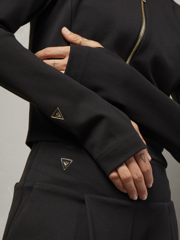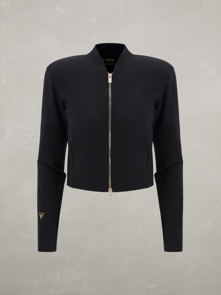 MACRON FELPA ERA MILO, essenziale e sofisticata, la felpa Era Milo in Punto Milano combina eleganza e praticità. La full zip frontale oro con doppio puller personalizzato illumina il design con un dettaglio ricercato, mentre le spalline aggiungono struttura e carattere. Il logo in silicone metallico oro sulla manica destra completa il capo con un tocco distintivo e contemporaneo.
