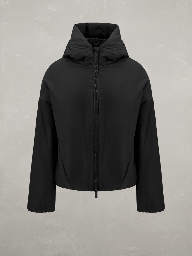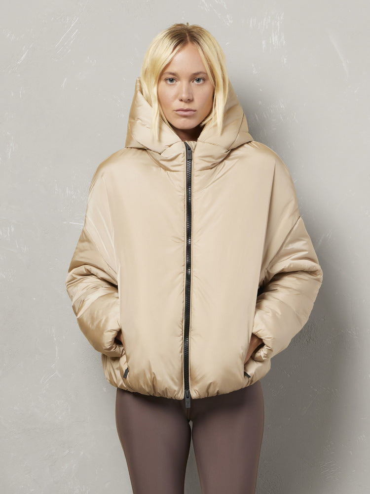 MACRON GIUBBOTTO KRISSY, casual e sofisticata, la giacca Krissy imbottita con cappuccio unisce comfort e design contemporaneo. La spalla scesa con taglio relaxed dona un look moderno e rilassato, mentre la zip frontale con doppio puller personalizzato aggiunge praticità e carattere. Le tasche laterali presentano invisible zip e puller personalizzati. Il logo gold stampato sulla manica destra completa il capo con un dettaglio elegante e distintivo.