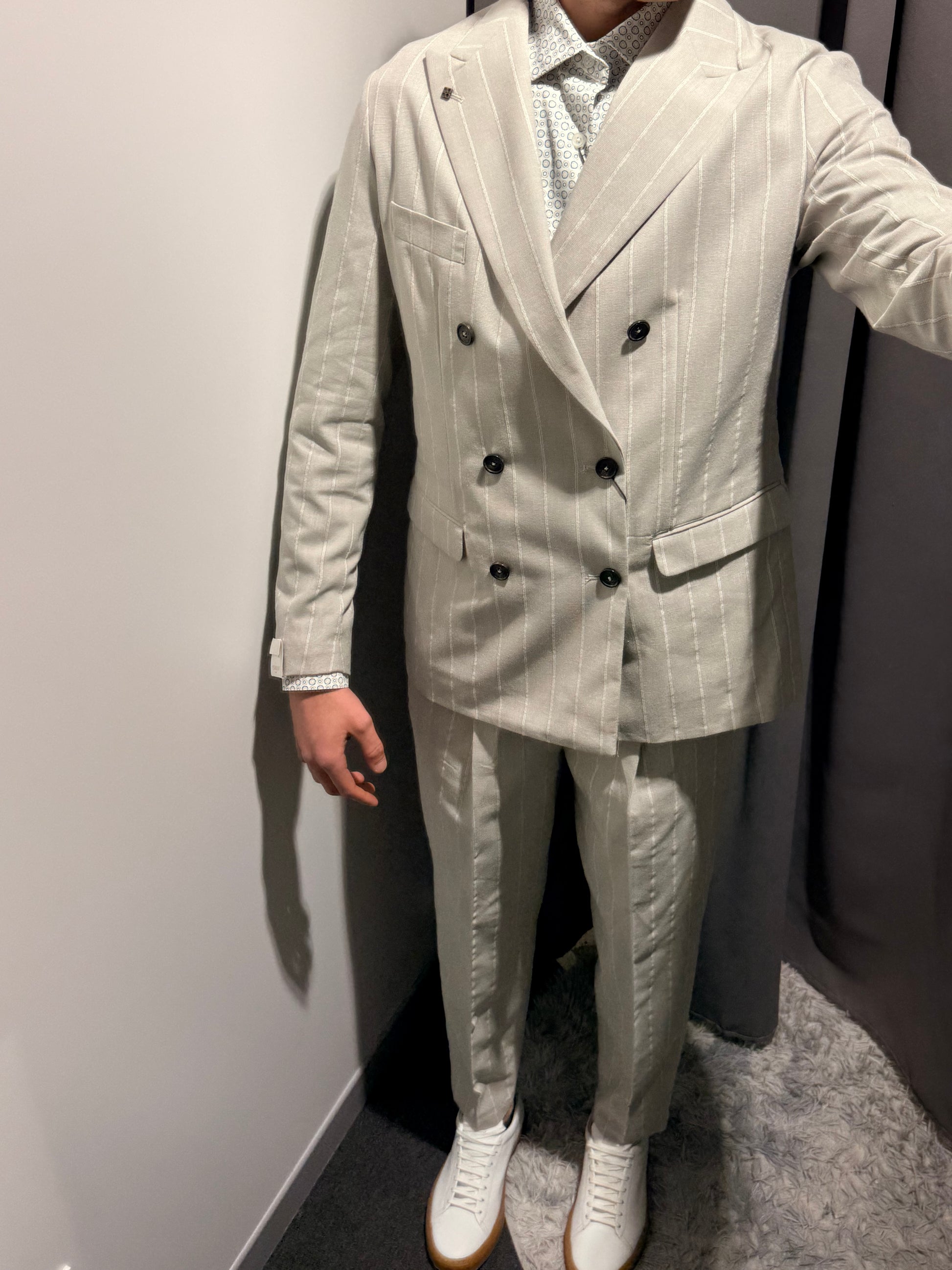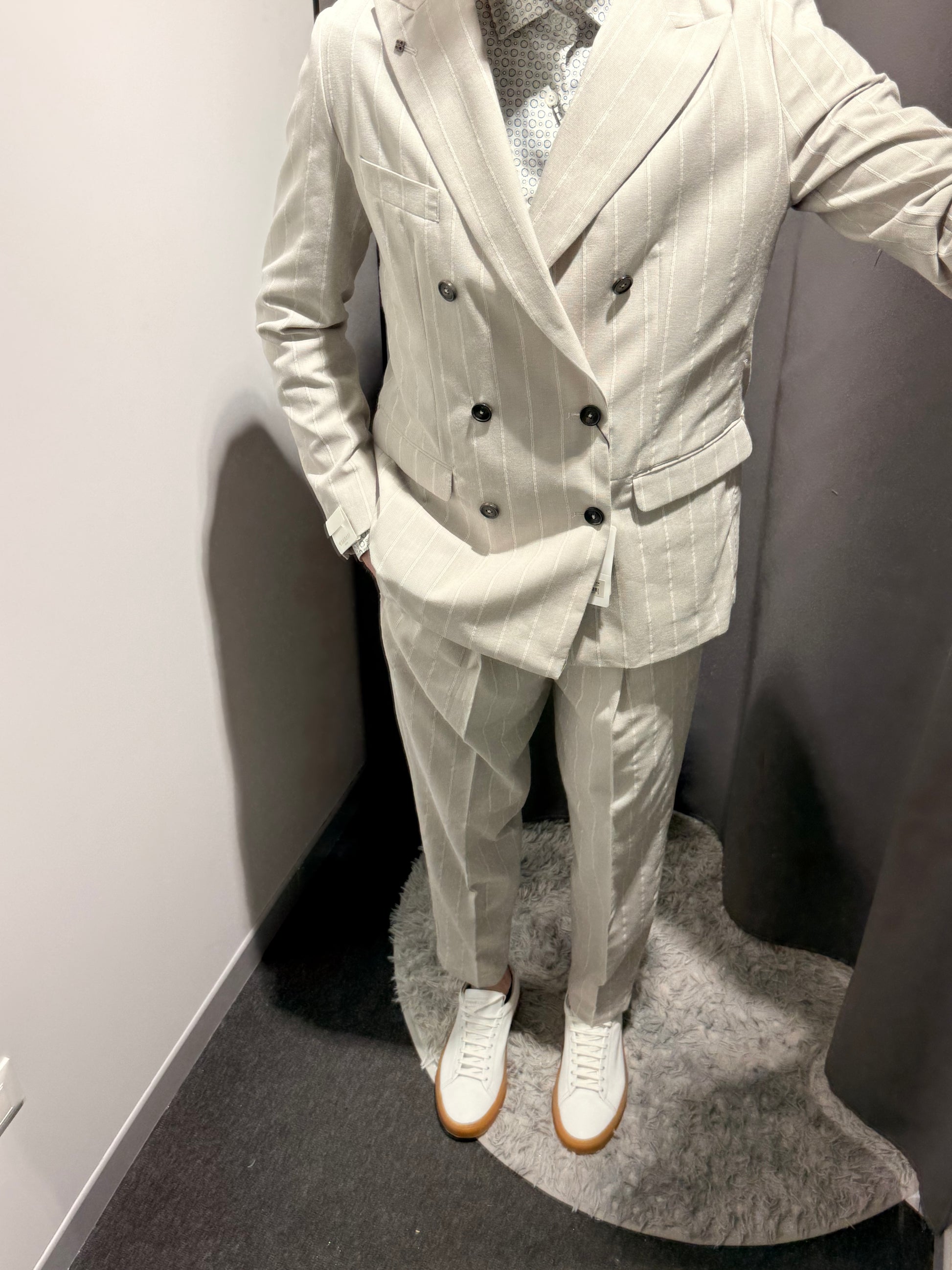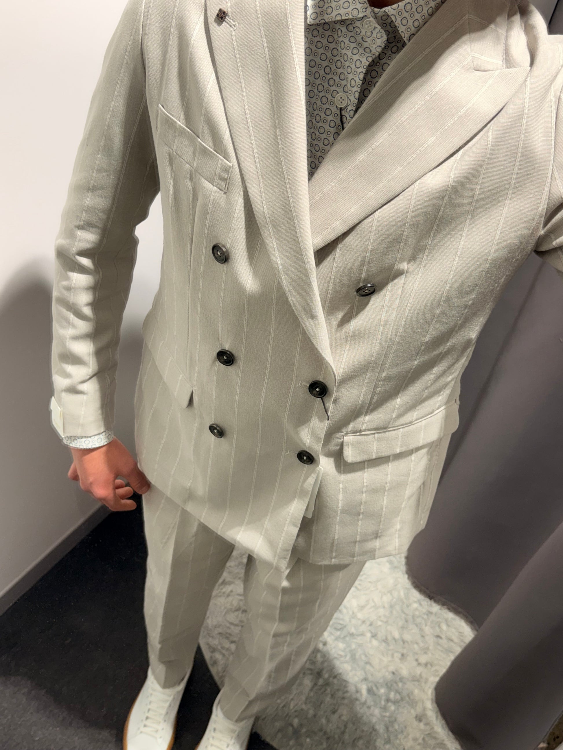 Markup abito gessato da uomo realizzato in misto lino e cotone, composto da giacca doppiopetto con revers classico, chiusura a bottoni, tasche con patta e spacchi posteriori. Il pantalone coordinato, dotato di tasche laterali e tasca a filetto posteriore, completa il look con una vestibilità confortevole e moderna.