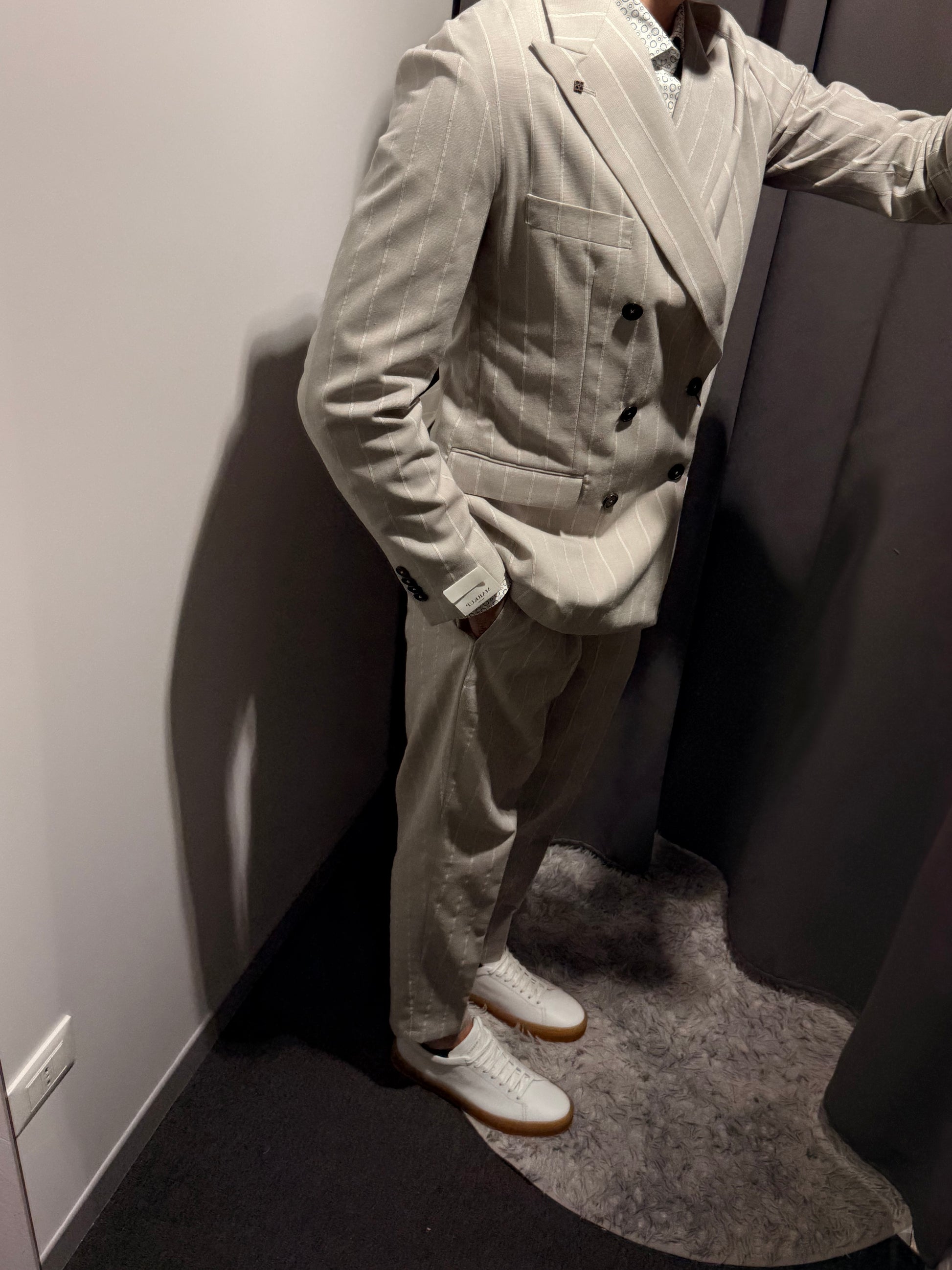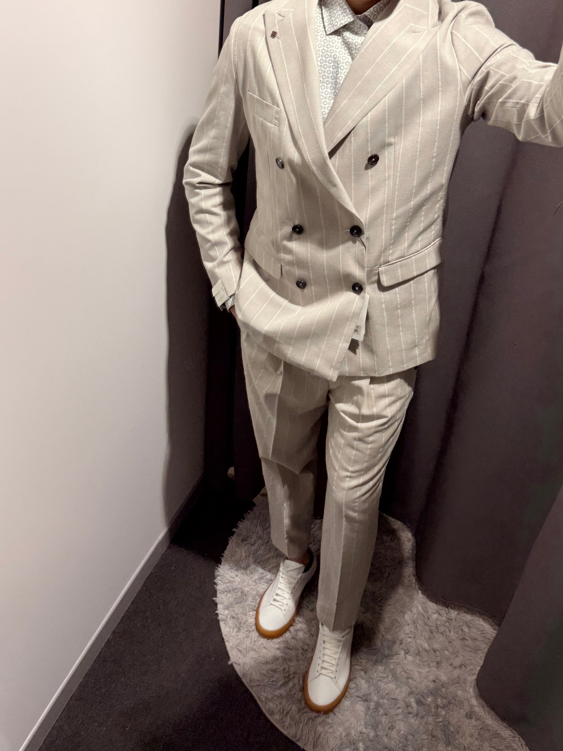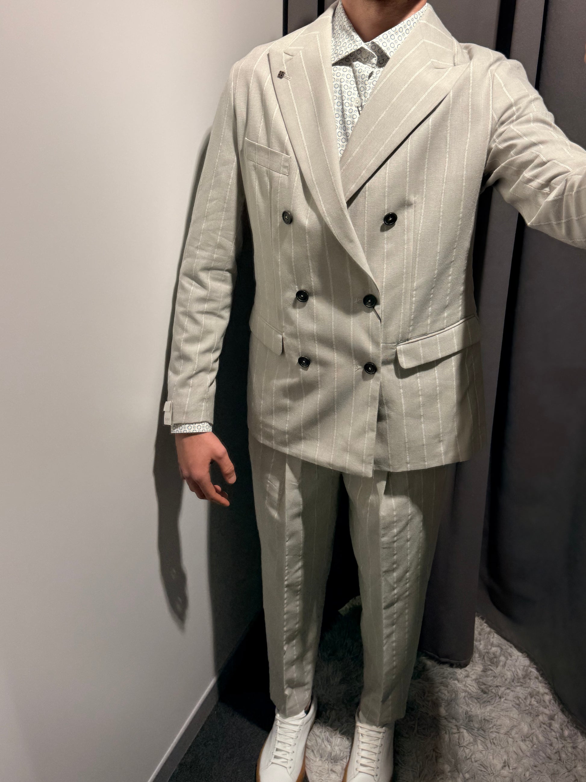 Markup abito gessato da uomo realizzato in misto lino e cotone, composto da giacca doppiopetto con revers classico, chiusura a bottoni, tasche con patta e spacchi posteriori. Il pantalone coordinato, dotato di tasche laterali e tasca a filetto posteriore, completa il look con una vestibilità confortevole e moderna.