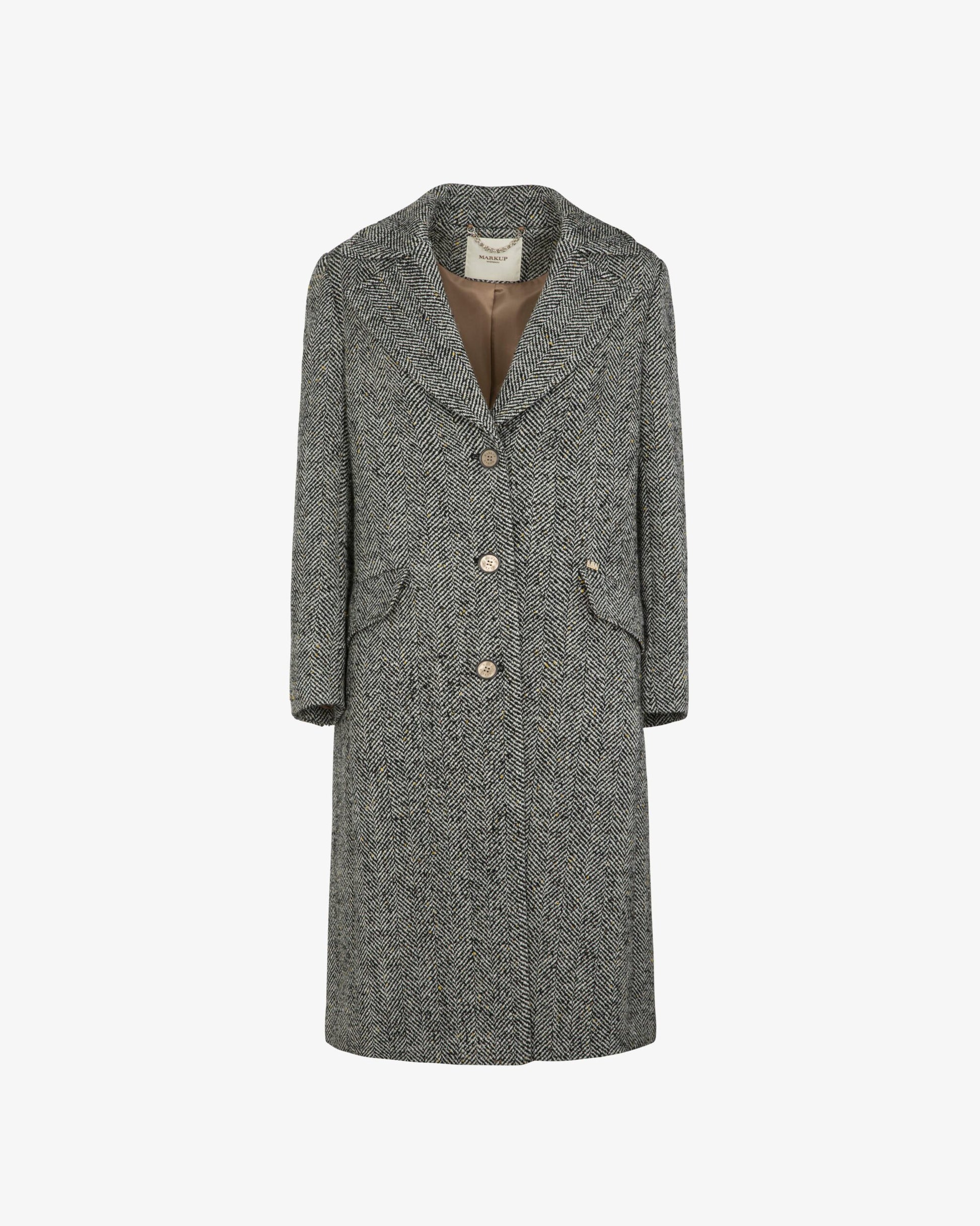 Cappotto lungo monopetto in tessuto spigato chiusura frontale con bottoni tasche con pattina