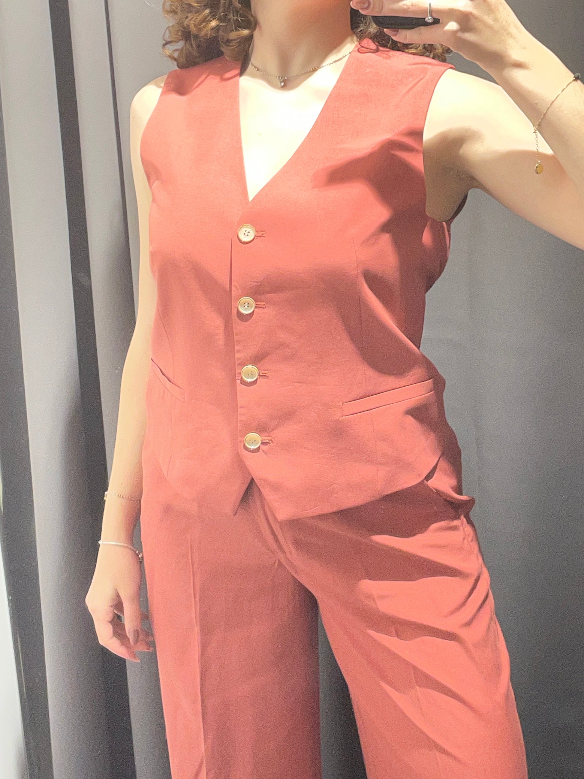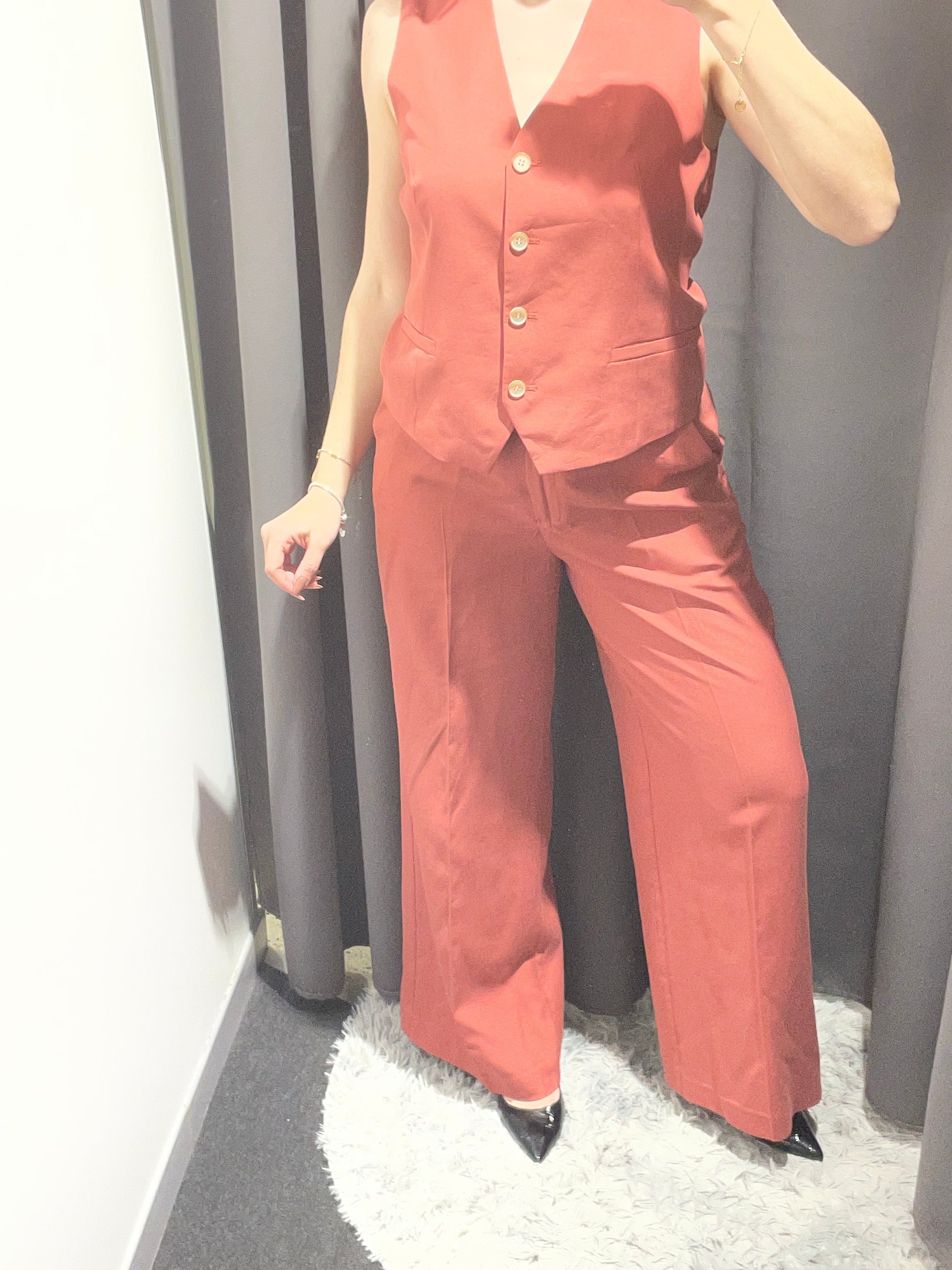 Completo elegante composto da gilet e pantaloni ampi in pregiato misto lino e viscosa. Il gilet presenta una silhouette raffinata con chiusura frontale, perfetto per creare outfit sofisticati sia casual che più formali. I pantaloni fluidi garantiscono comfort e libertà di movimento, con una vestibilità generosa che segue le tendenze contemporanee. La combinazione di lino e viscosa offre traspirabilità naturale e una caduta morbida del tessuto, ideale per la stagione primaverile ed estiva. Un pezzo versatile che eleva qualsiasi guardaroba con stile e praticità. Rosso mattone.