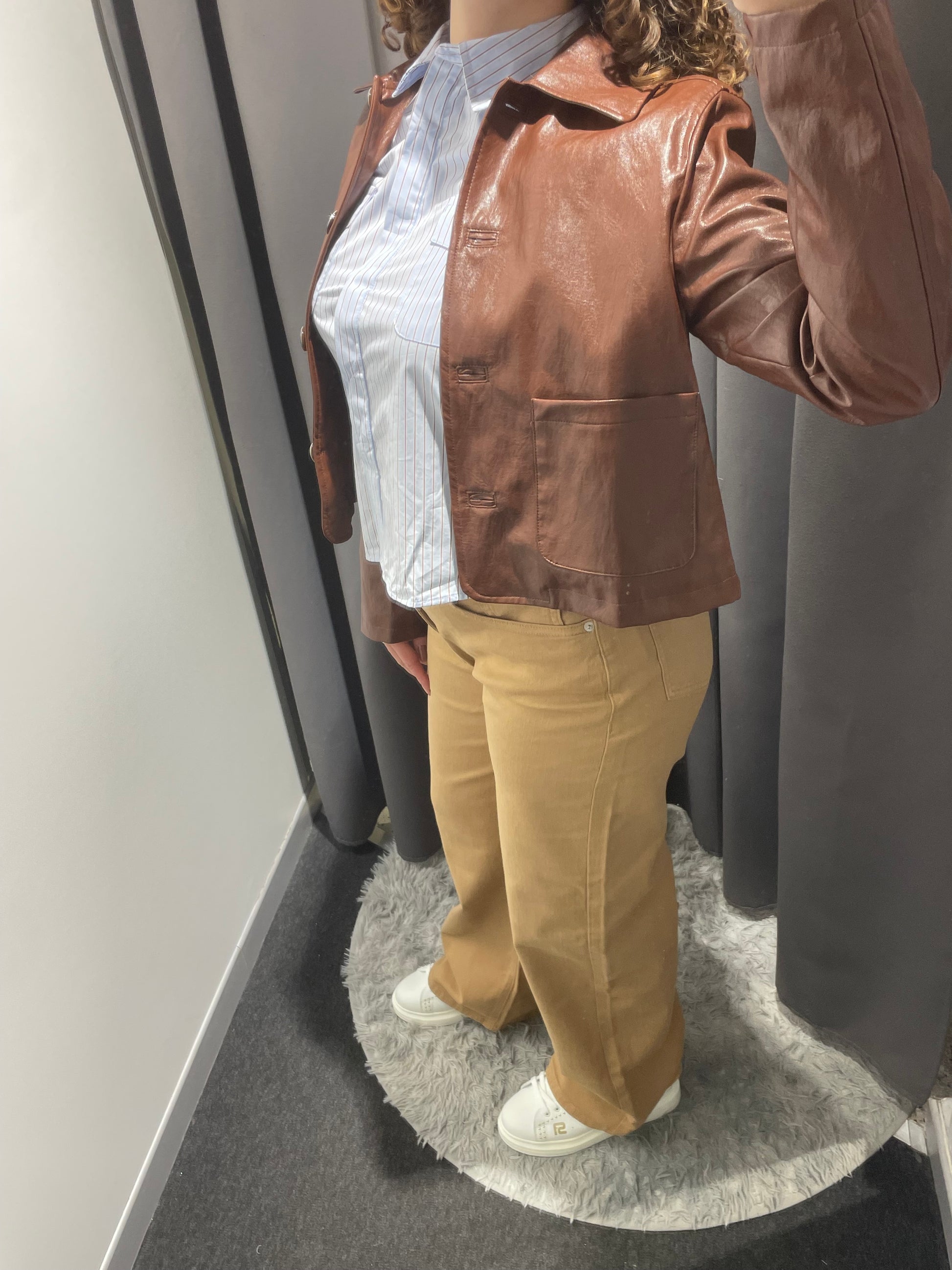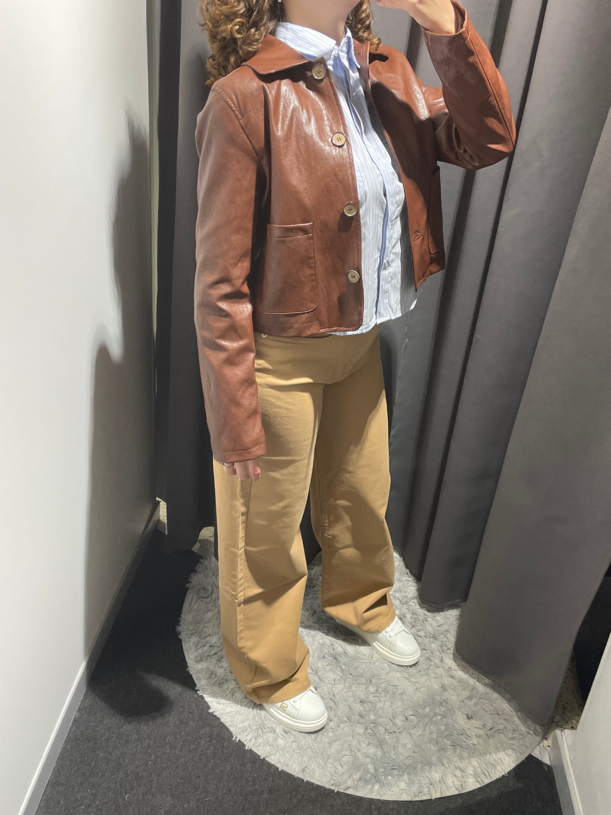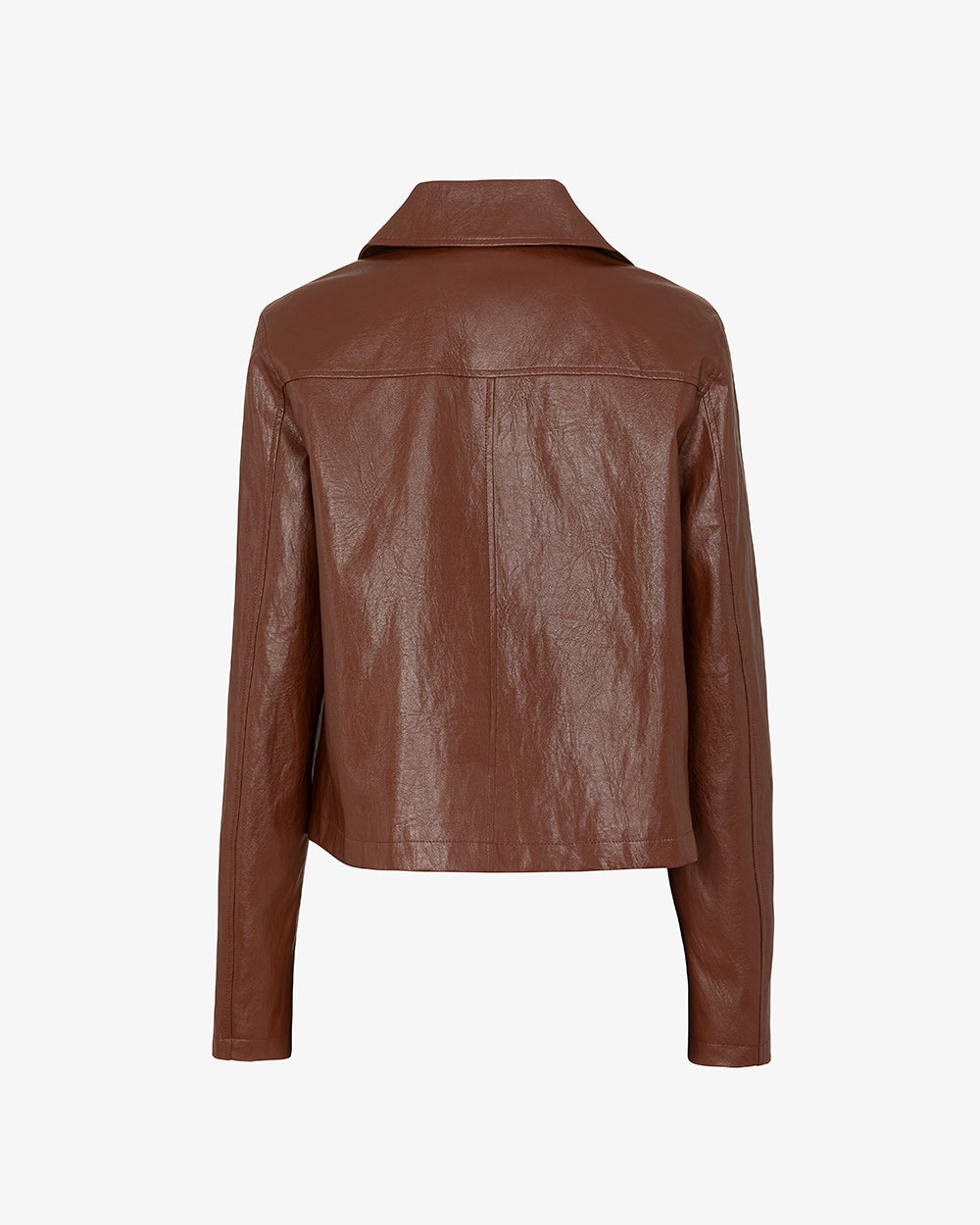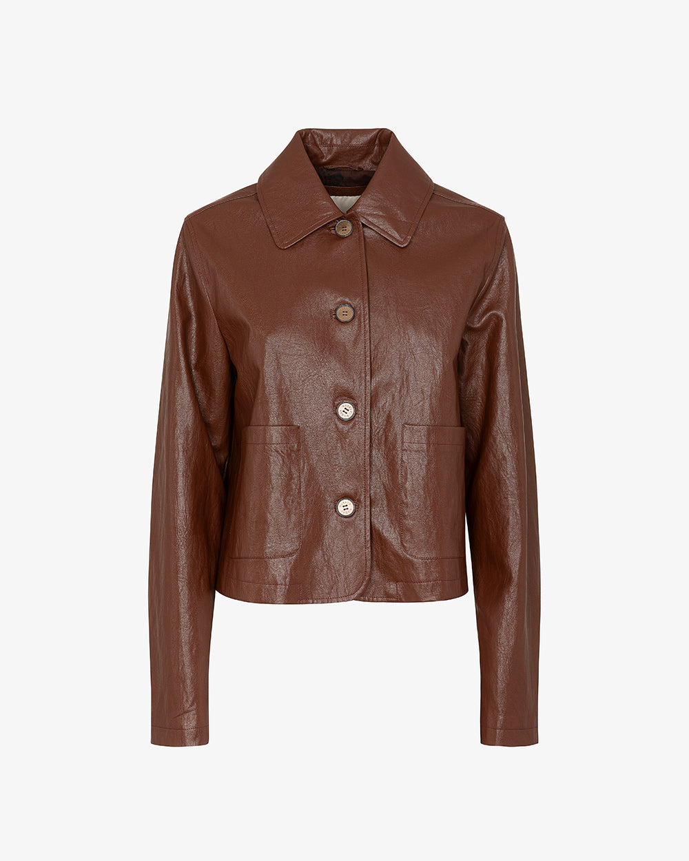 Giacca corta in similpelle liscia con finitura leggermente lucida. Chiusura frontale con bottoni, collo classico. Due tasche applicate sul davanti, vestibilità regolare e leggermente corta, con taglio diritto.