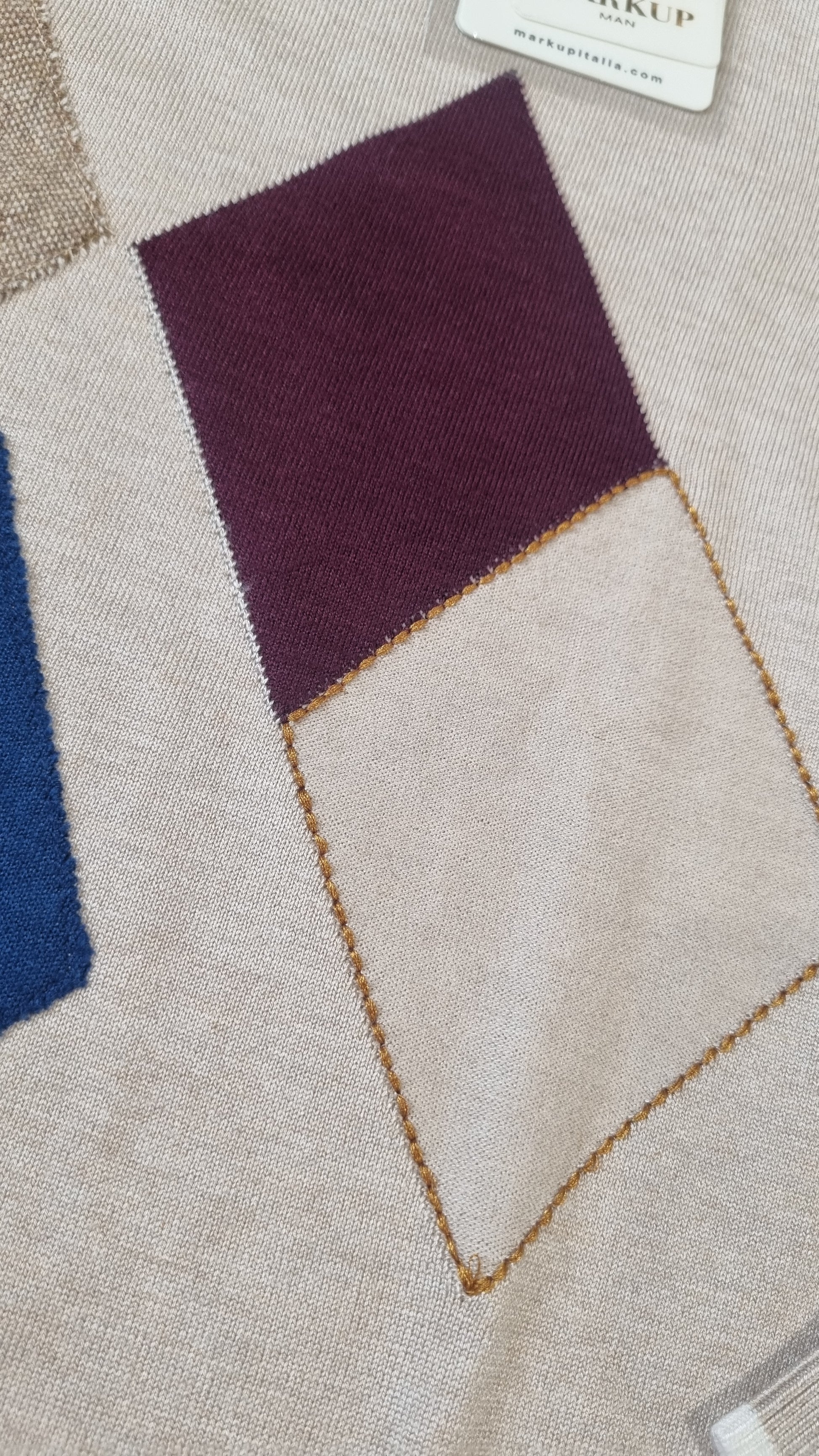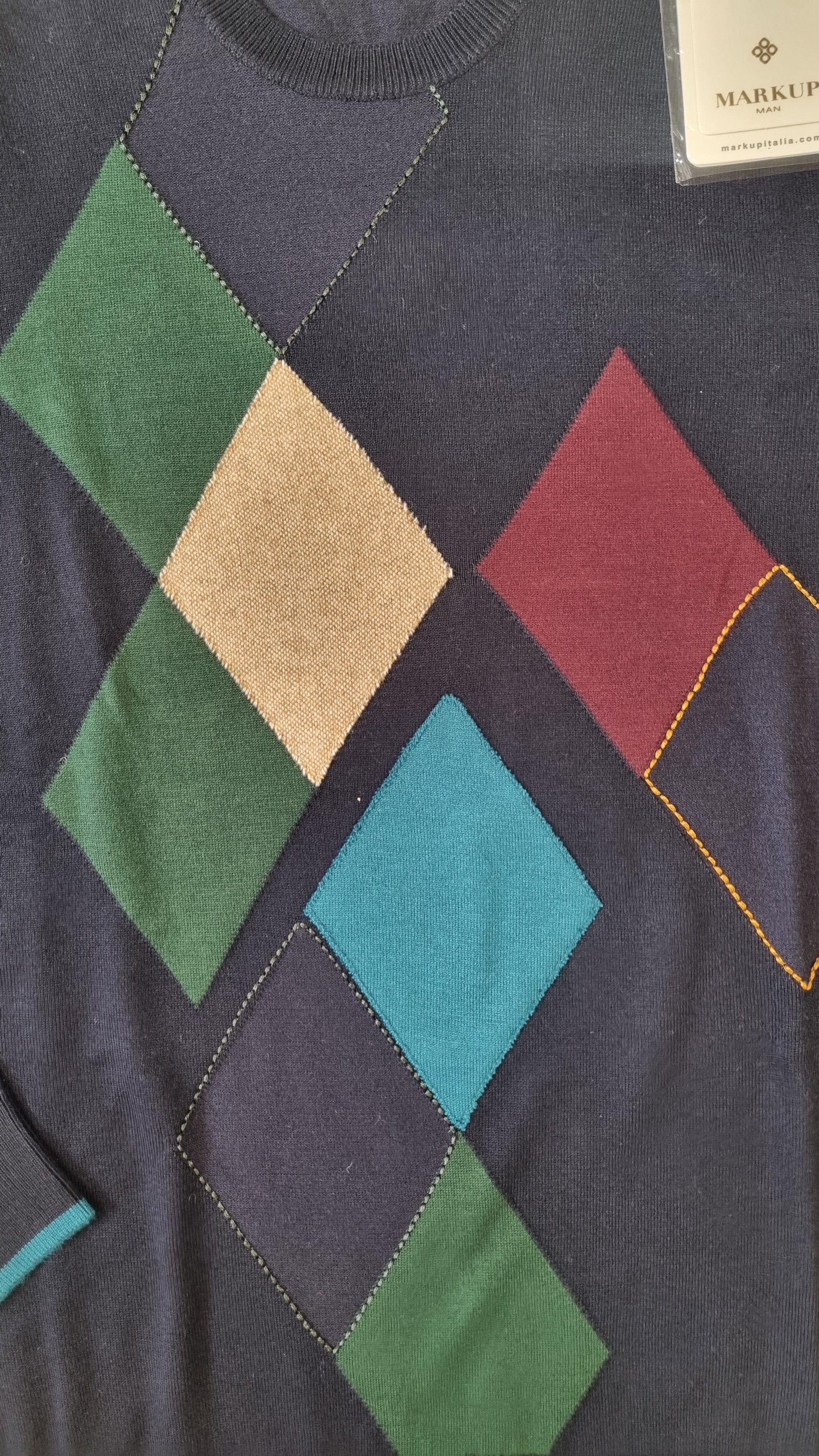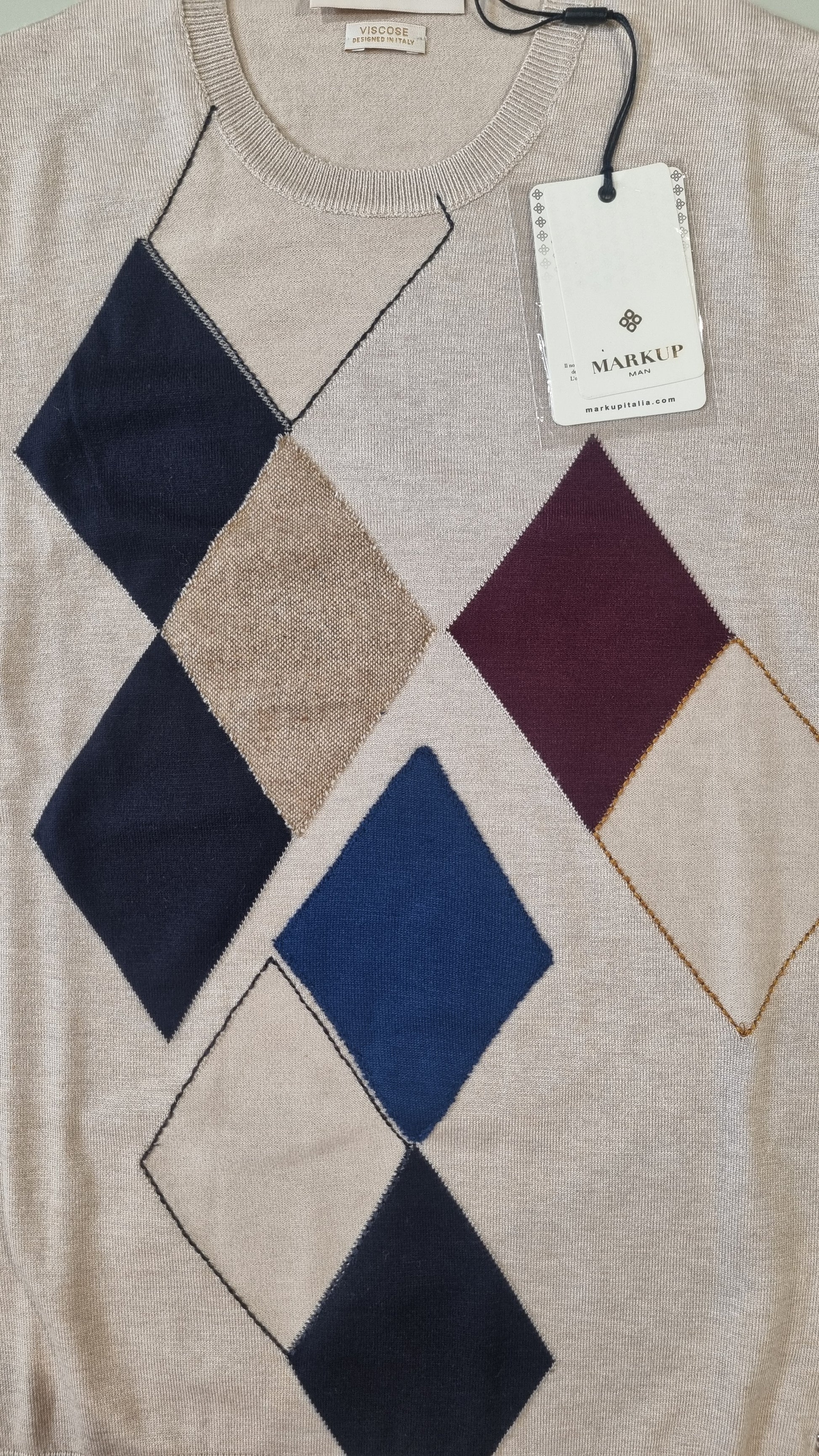 MARKUP Maglia motivo rombi, contrasti di colore frontali e stampa, patch e ricami.