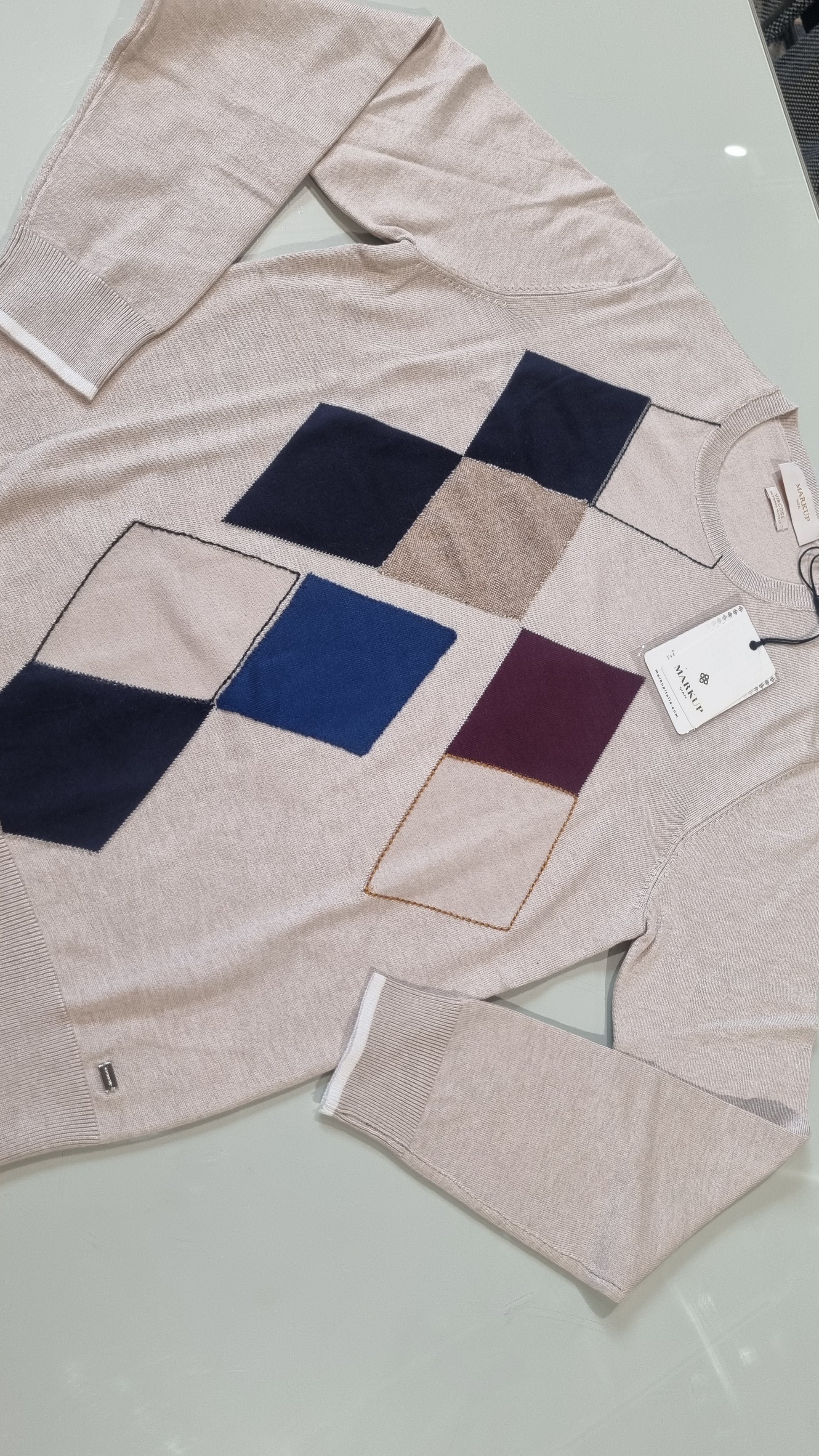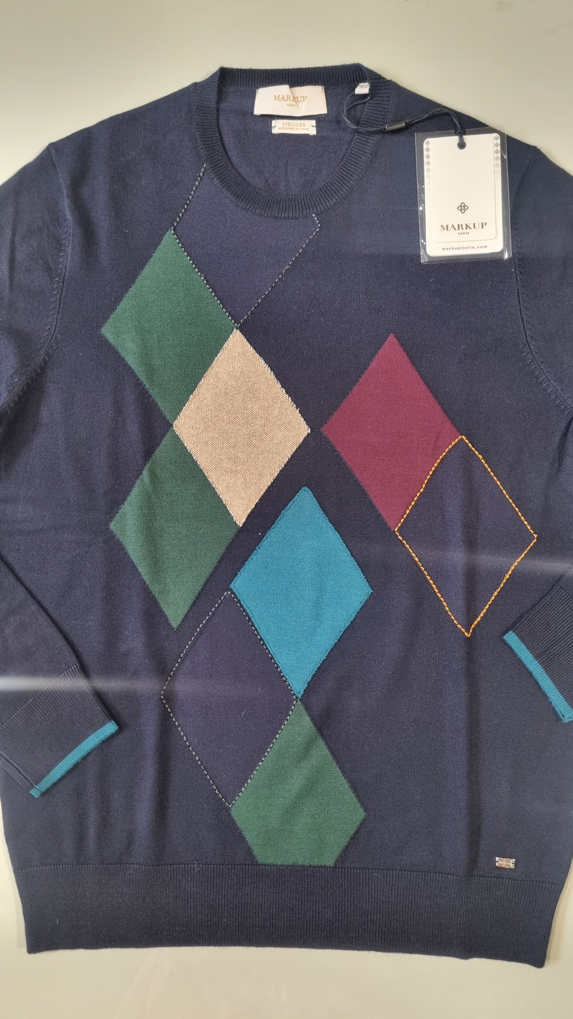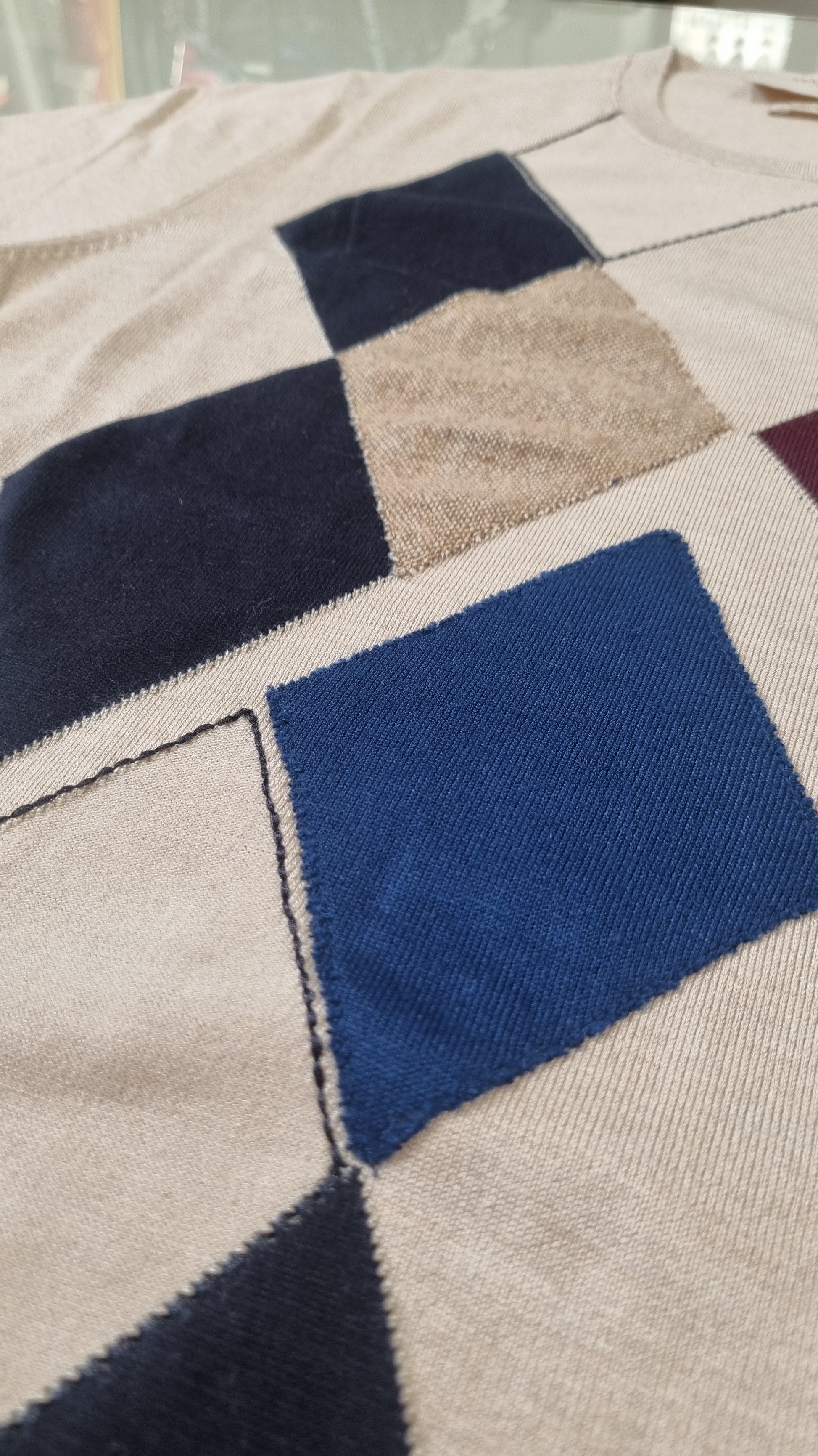 MARKUP Maglia motivo rombi, contrasti di colore frontali e stampa, patch e ricami.