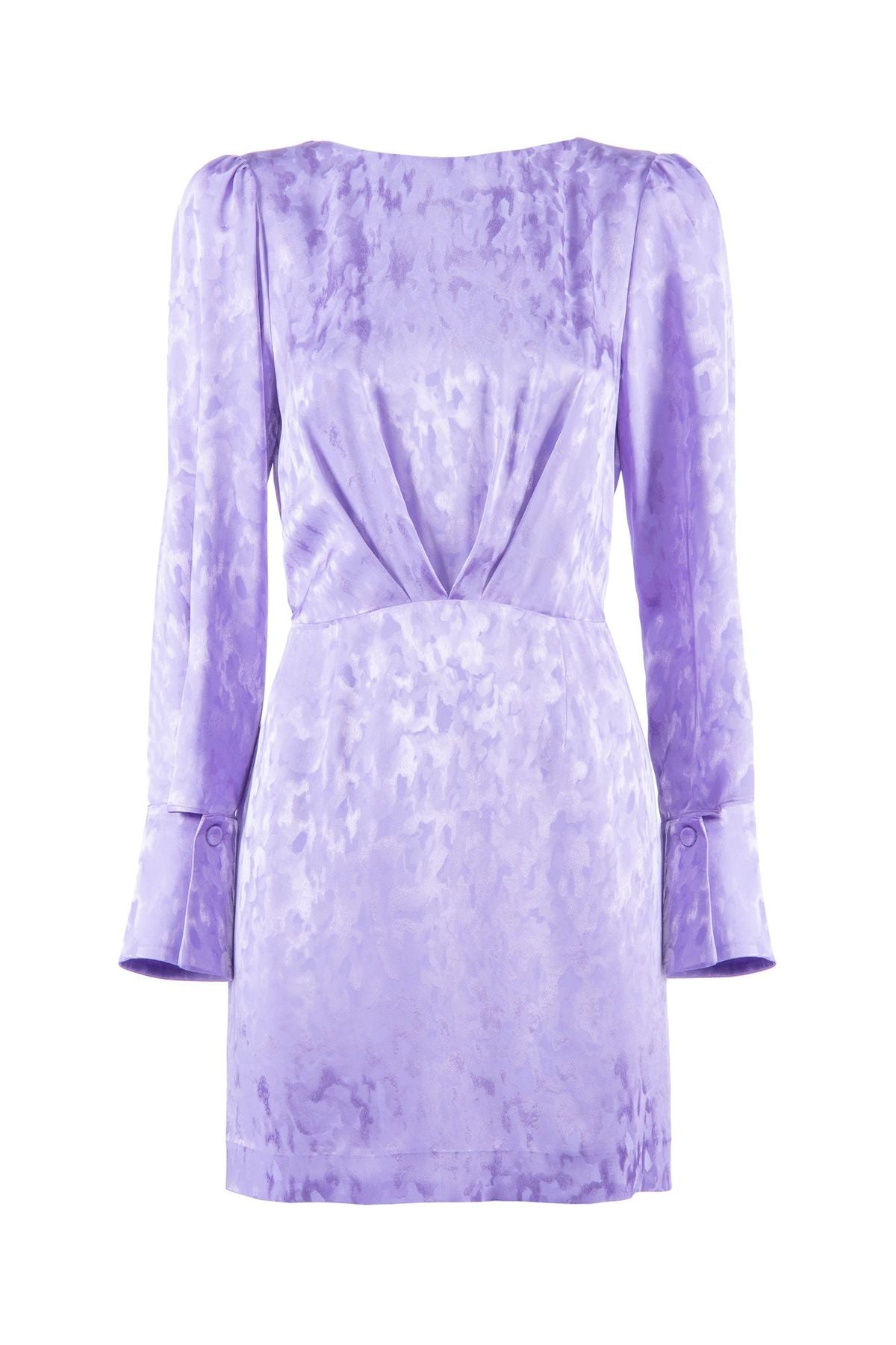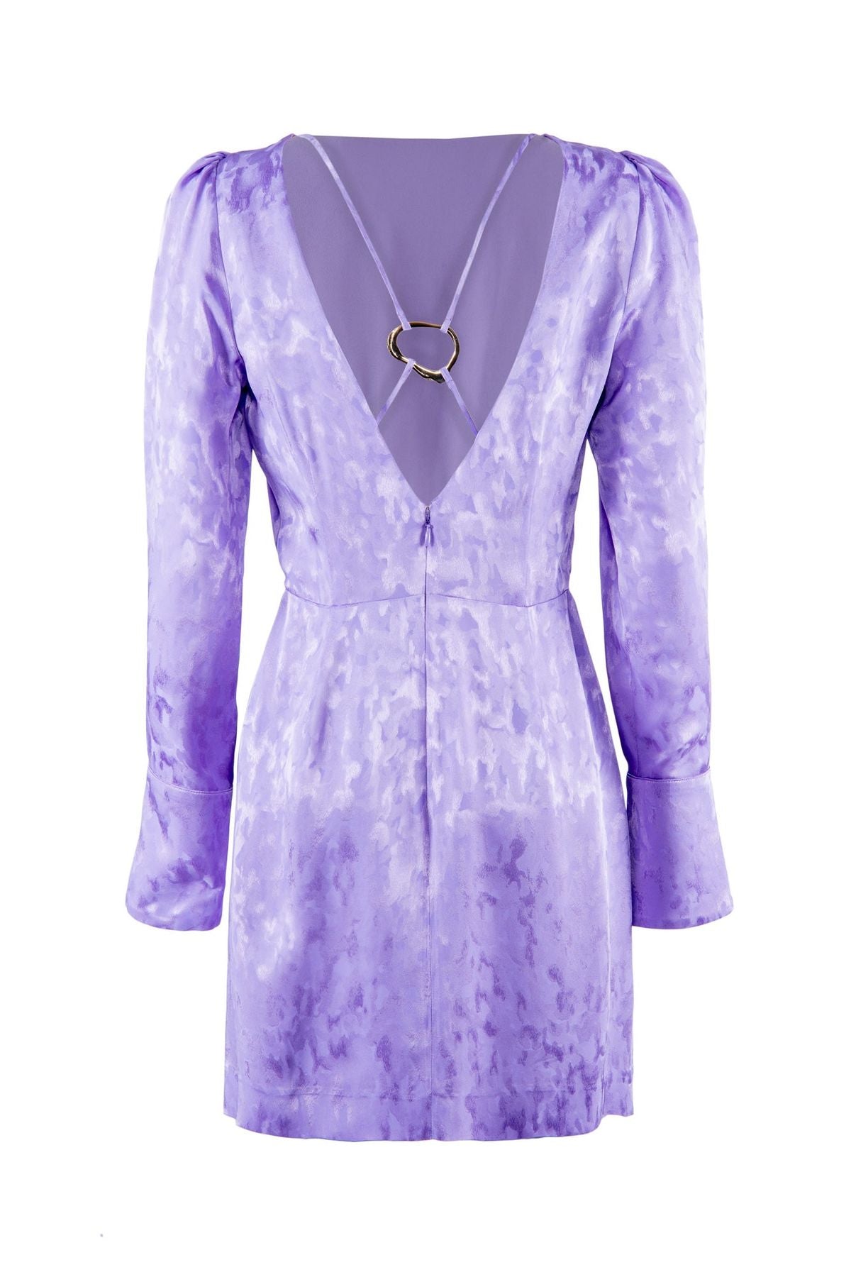 Abito corto lilla con maniche lunghe e schiena scoperta.