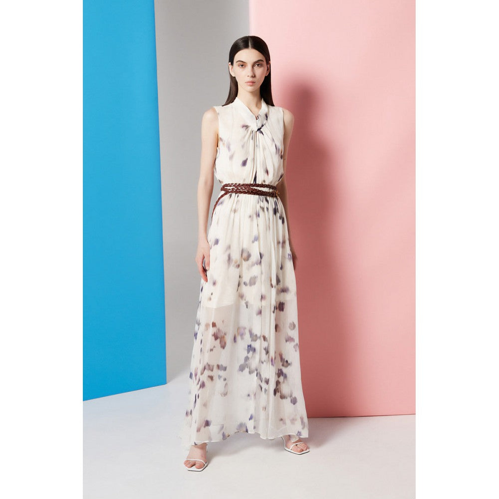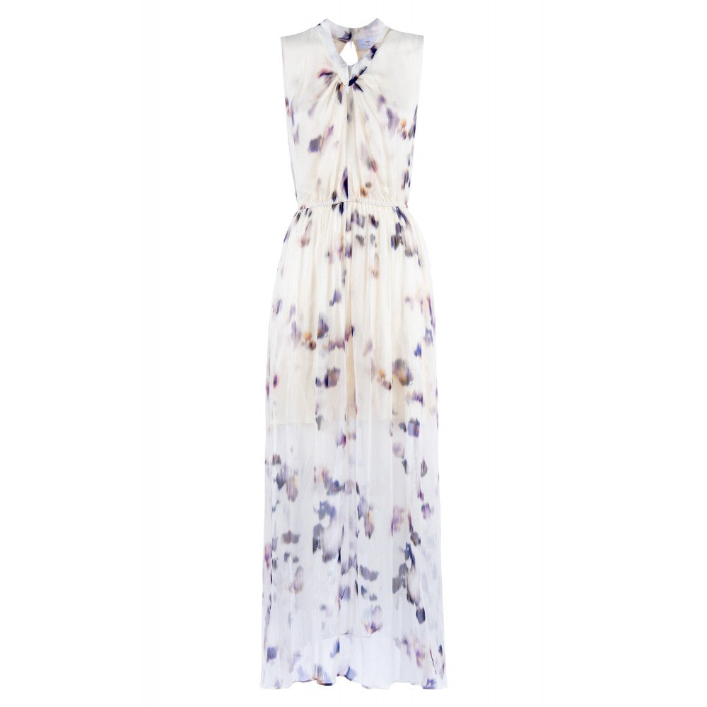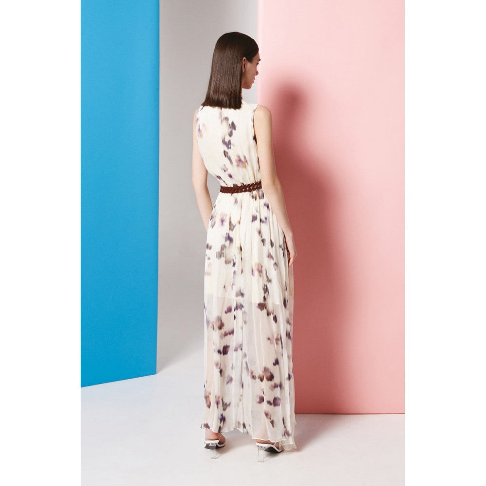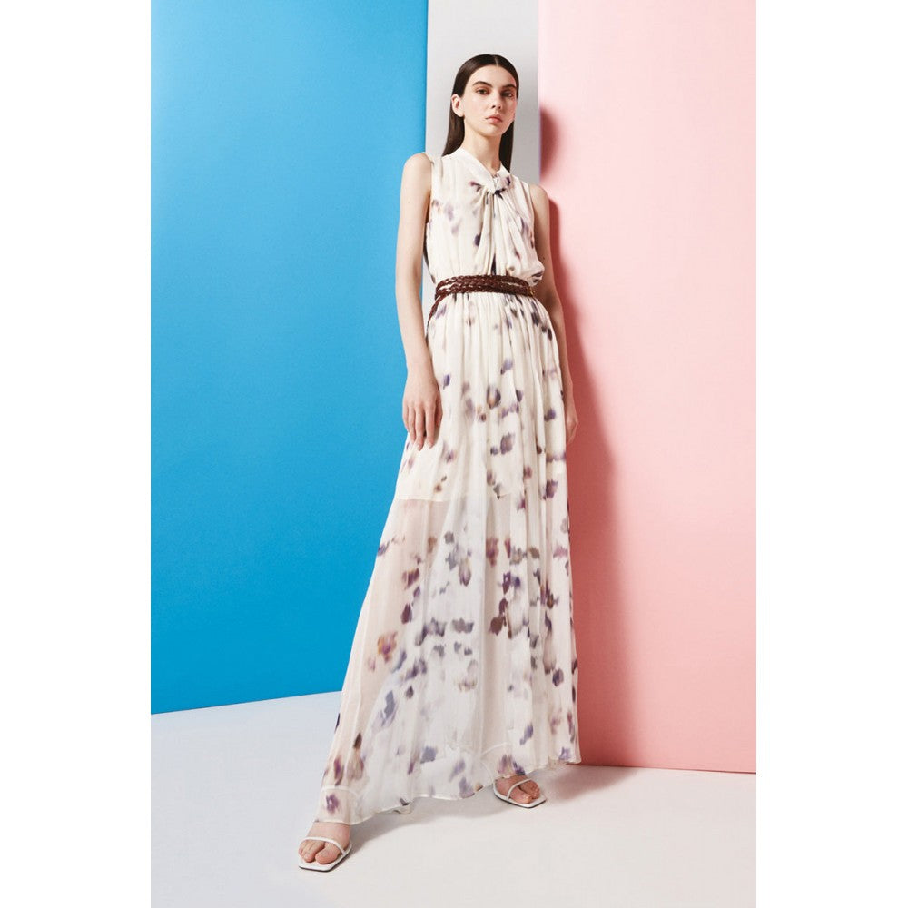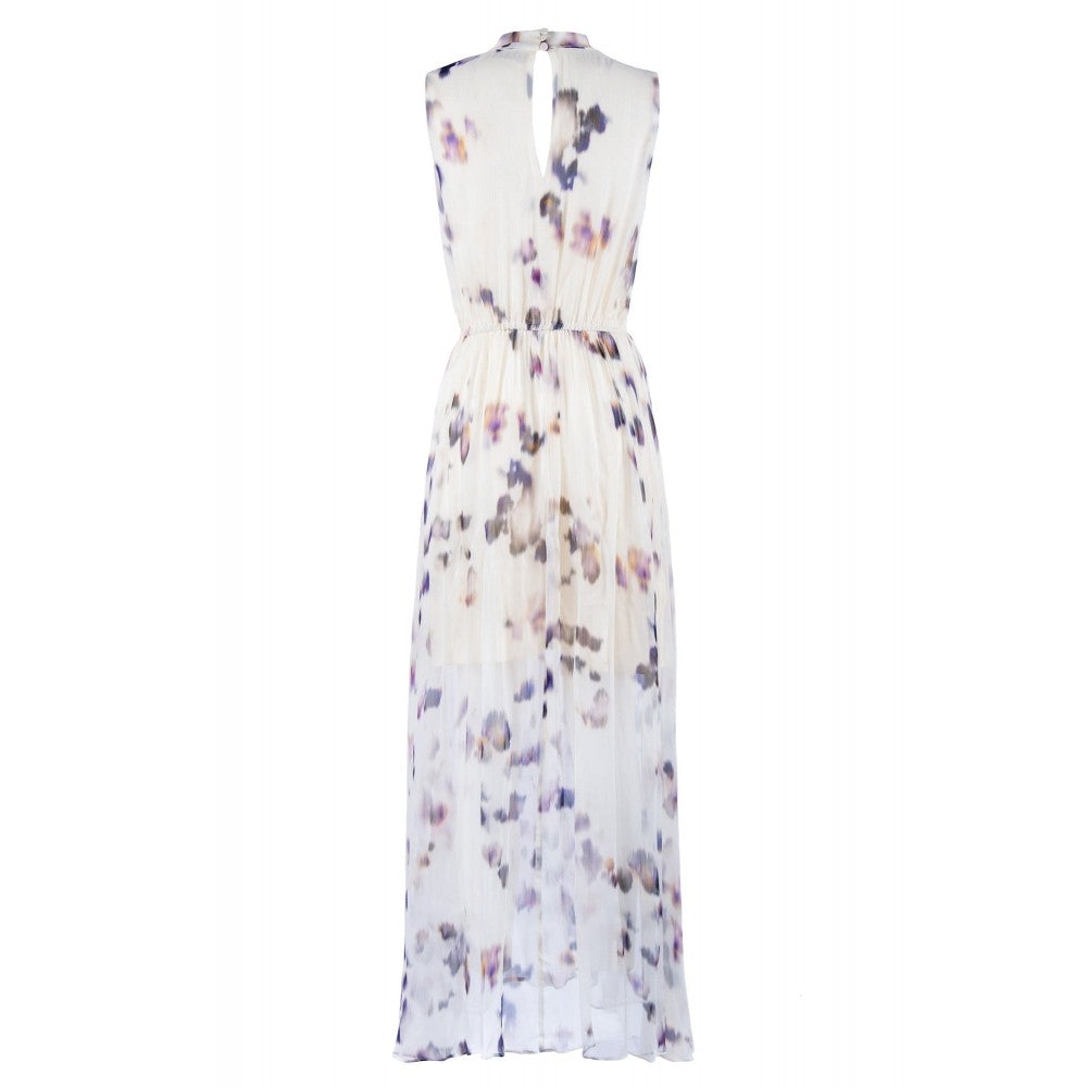 Abito lungo smanicato con apertura a goccia sul davanti in creponne di viscosa stampata.