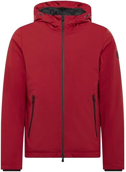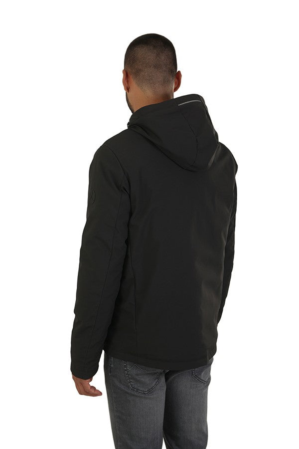Realizzato in tessuto tecnico, con cappuccio con coulisse. Tasche frontali con zip, tasche interne. Polsini in lycra. chiusura con zip a doppio cursore.