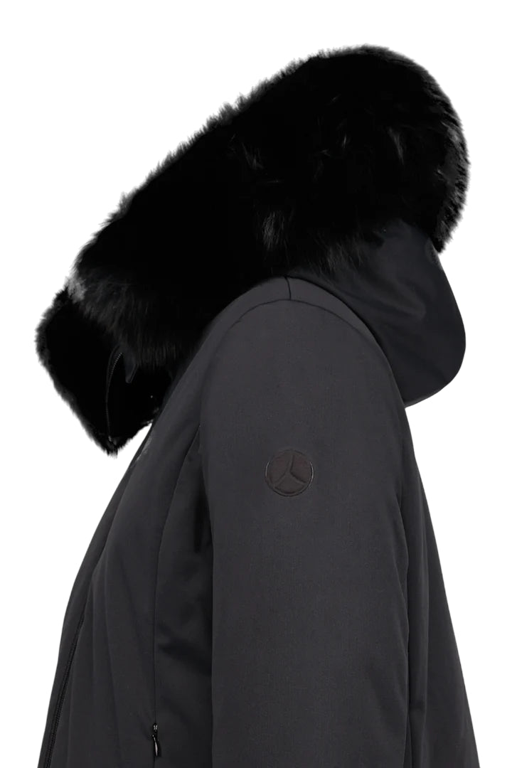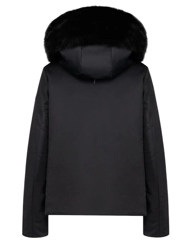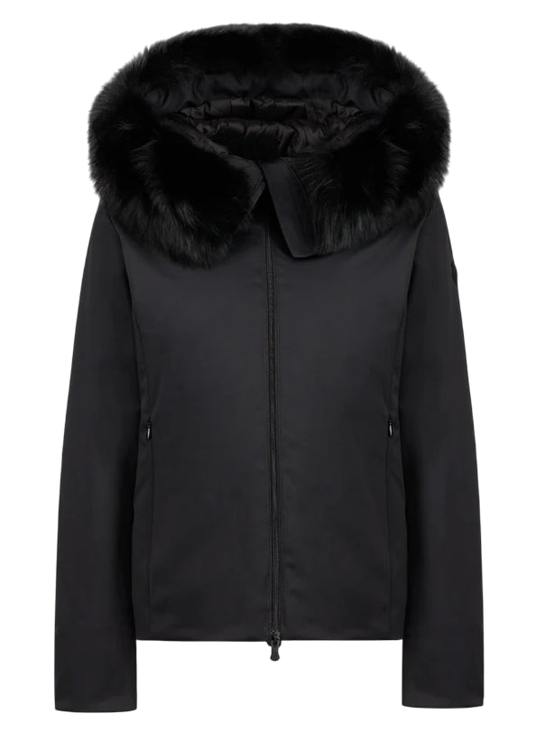 Giubbino in tessuto tecnico con cappuccio in pelliccia rimovibile.