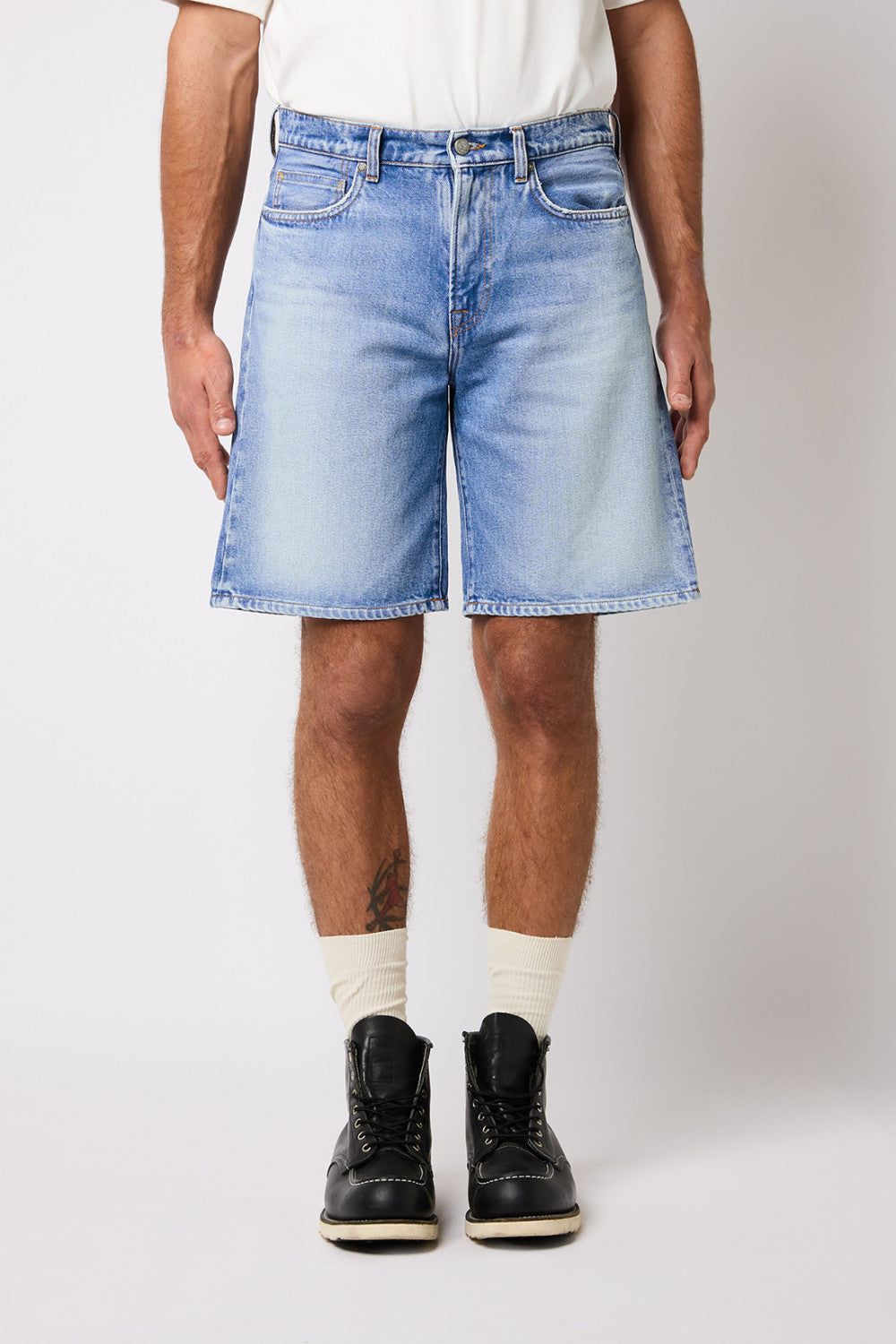 - Bermuda Week Work in denim con lavaggio medio e impunture in contrasto.